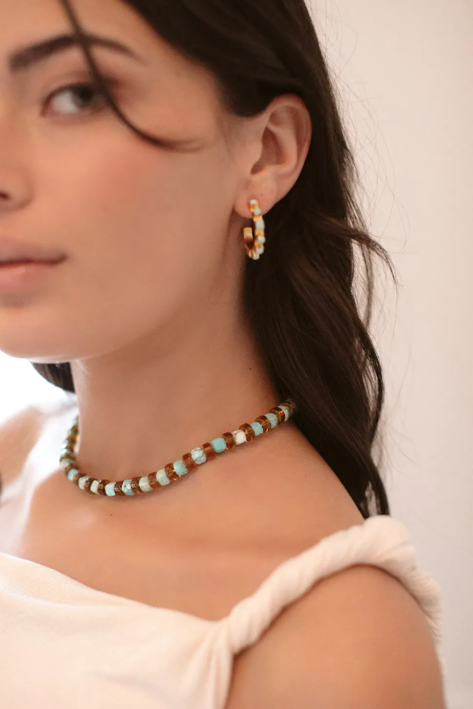 The mother-daughter duo behind Brinker + Eliza combine their experience in metalsmithing and fashion to create incredibly unique jewelry that feels custom-made. Employing pearls, shells, and earth’s most prized organic forms, these are pieces to be not just worn but treasured. The Astrid Necklace is the ultimate *cool kid* strand necklace. It features a strand of alternating turquoise semi-precious gemstone cube beads and rootbeer colored glass slices.