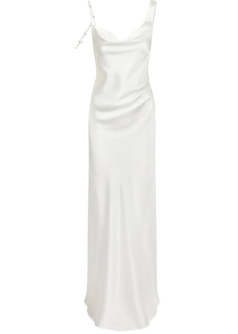 Handmade at its London atelier, The OWN Studio’s signature style combines pared-back, contemporary silhouettes with unexpected vintage details resulting in considered, minimal styles for the modern woman. The label brings a fresh and contemporary approach to wedding and evening wear. The Asymmetric Cowl Dress with Pearl Straps | STYLE 019 exudes effortless glamour. Its sweeping asymmetric neckline tumbles into a soft cowl which creates an incredibly soft line across the décolletage, finished by off the shoulder baroque pearl detail. Soft ruching at the waist is incredibly flattering and adds extra definition. A beautiful draped pearl necklace means the back is just as stunning as the front.