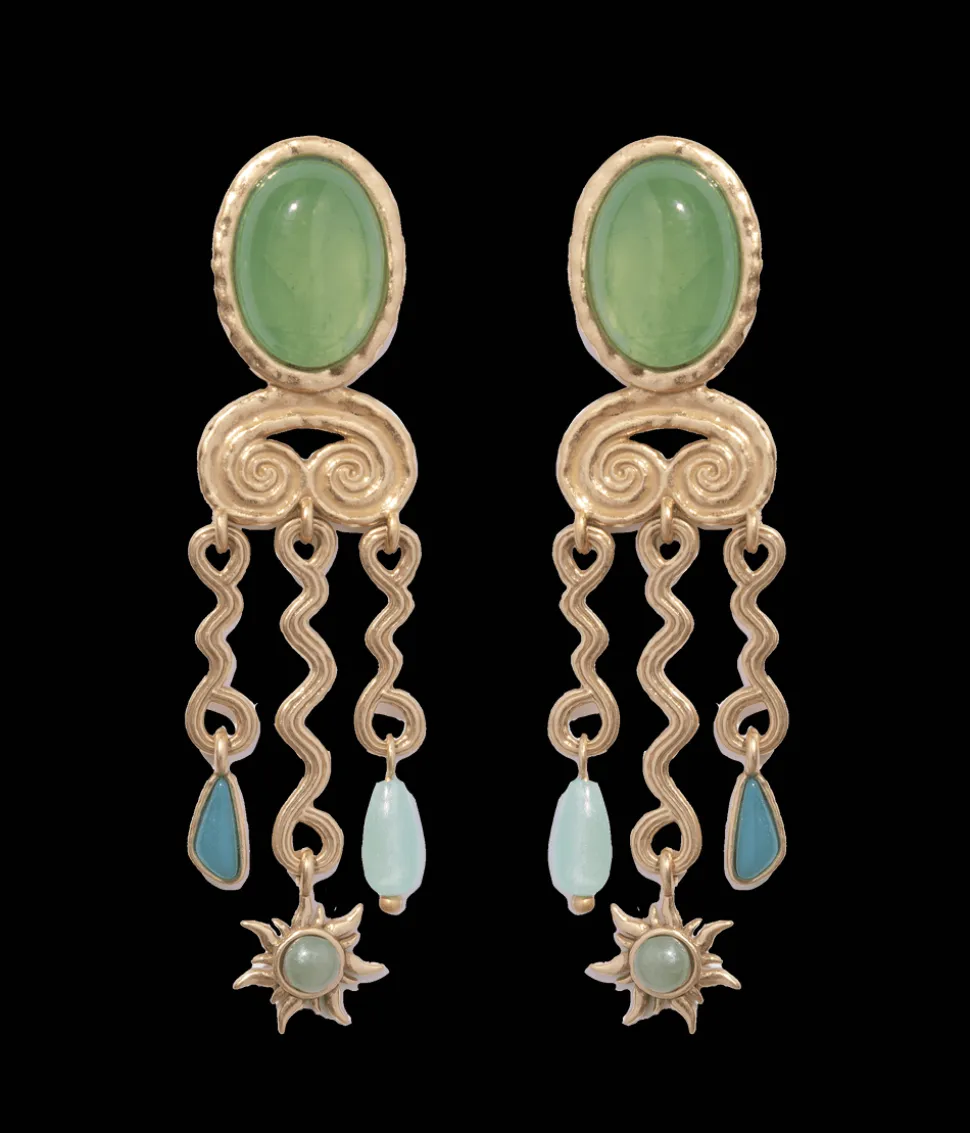 Loren Barham founded her jewelry line in 2005 as a means to reconnect with the vintage jewels that inspired her as a child. Today, the dynamic, artistic, original pieces of Loren Hope, designed at their flagship store in Newport, Rhode Island, serve as a bridge between nostalgia and thoroughly modern women everywhere. Inspired by Grecian motifs and Mediterranean hues, the Athens Earrings are a vibrant expression of wanderlust. Genuine chalcedony stones anchor an array of dangling charms, creating fluid movement and eye-catching shape. Bold yet wearable, they’re a radiant finishing touch for any far-flung escape—or city night out.