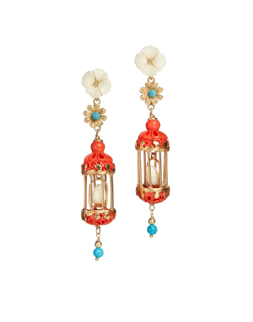 18K yellow gold vermeil. Natural and composite coral, horn, and turquoise. Custom variations are available. For pierced ears. Made in Italy.