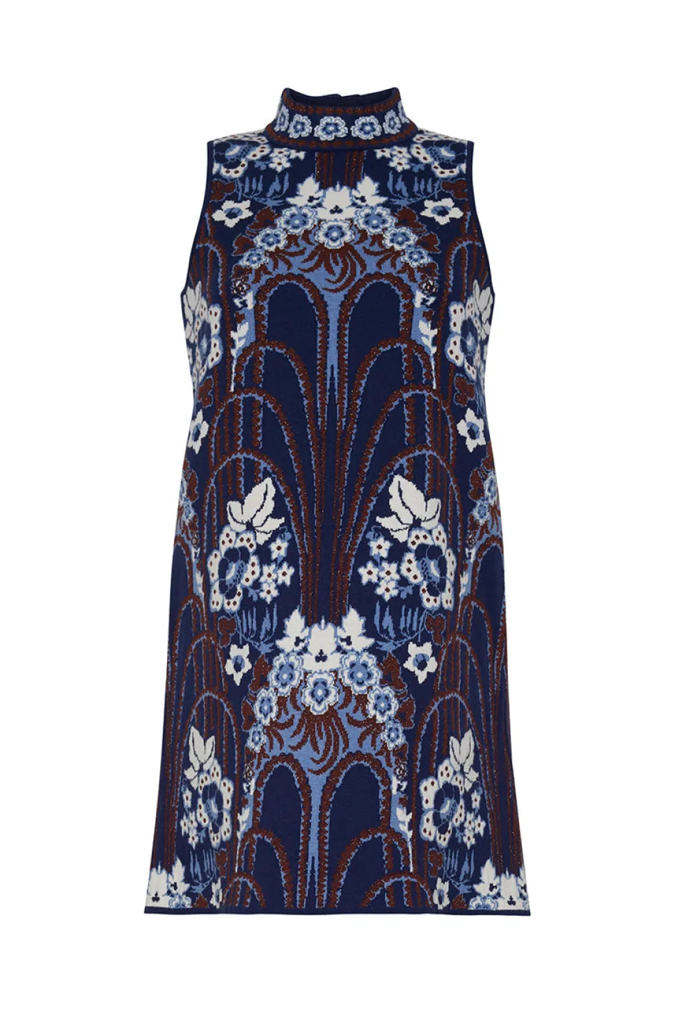Mini-length fit-and-flare dress in novelty birdseye floral jacquard knit. Crew neckline. Fitted bodice with gently flared skirt. Short sleeves. Slip-on style. Unlined.