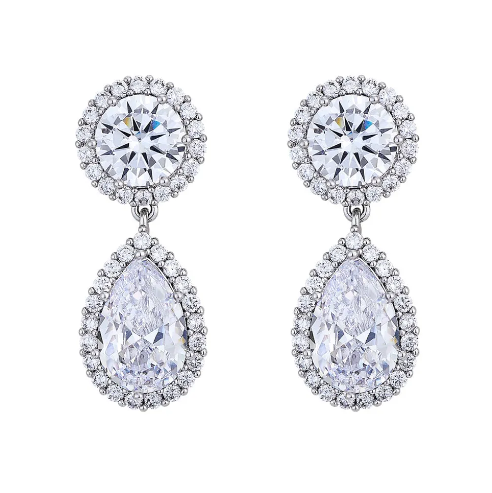 Inspired by art, architecture and the founder’s global journeys, ASHA by Ashley McCormick introduces bold, sophisticated jewelry, clothing, and accessories made from only the finest materials. From everyday glamour to the red carpet, these statement pieces are as eye-catching as they are classic. The Babe Earring features a circular post with an elegant pear-shaped drop outlined in a pave style. Cubic zirconia are embedded in white rhodium.