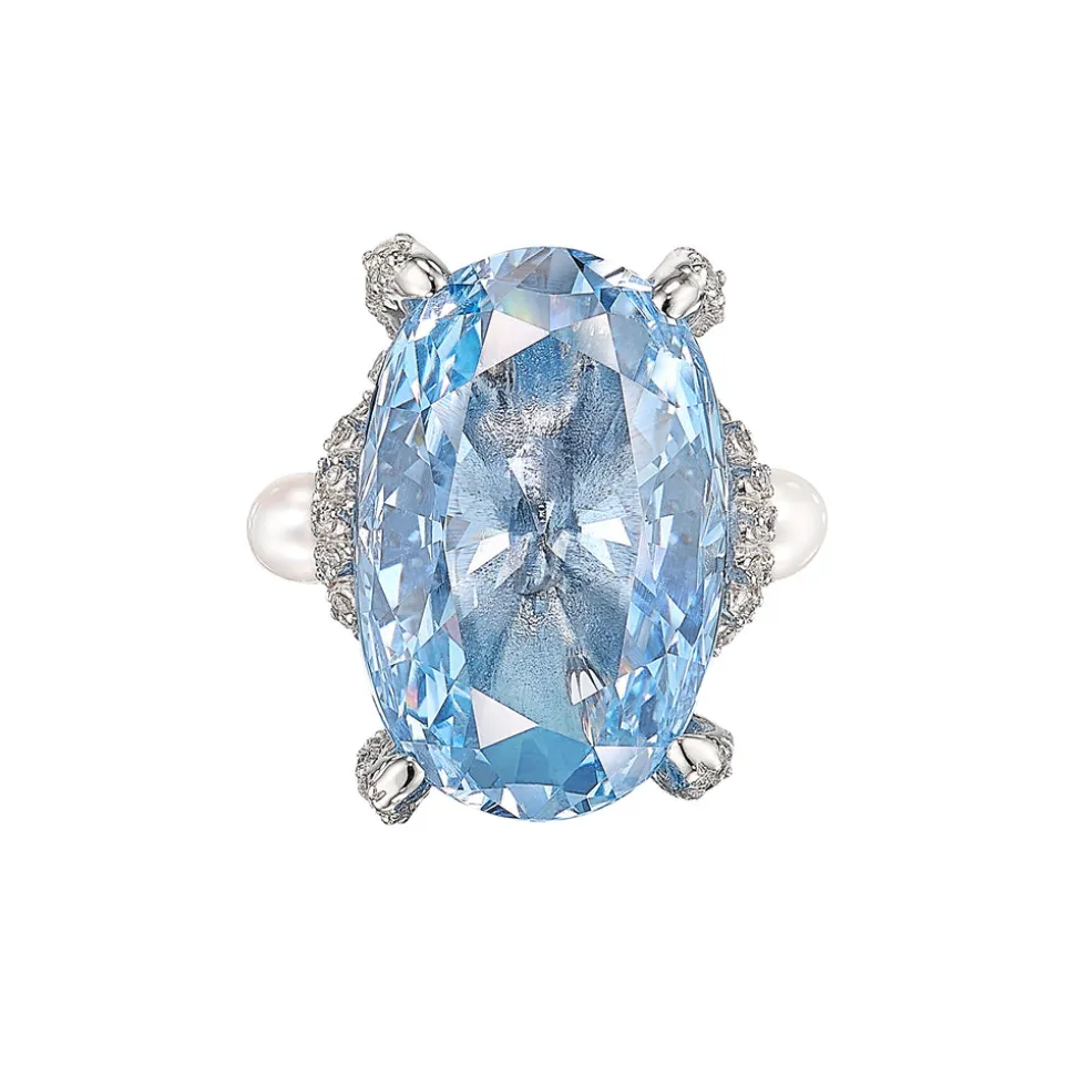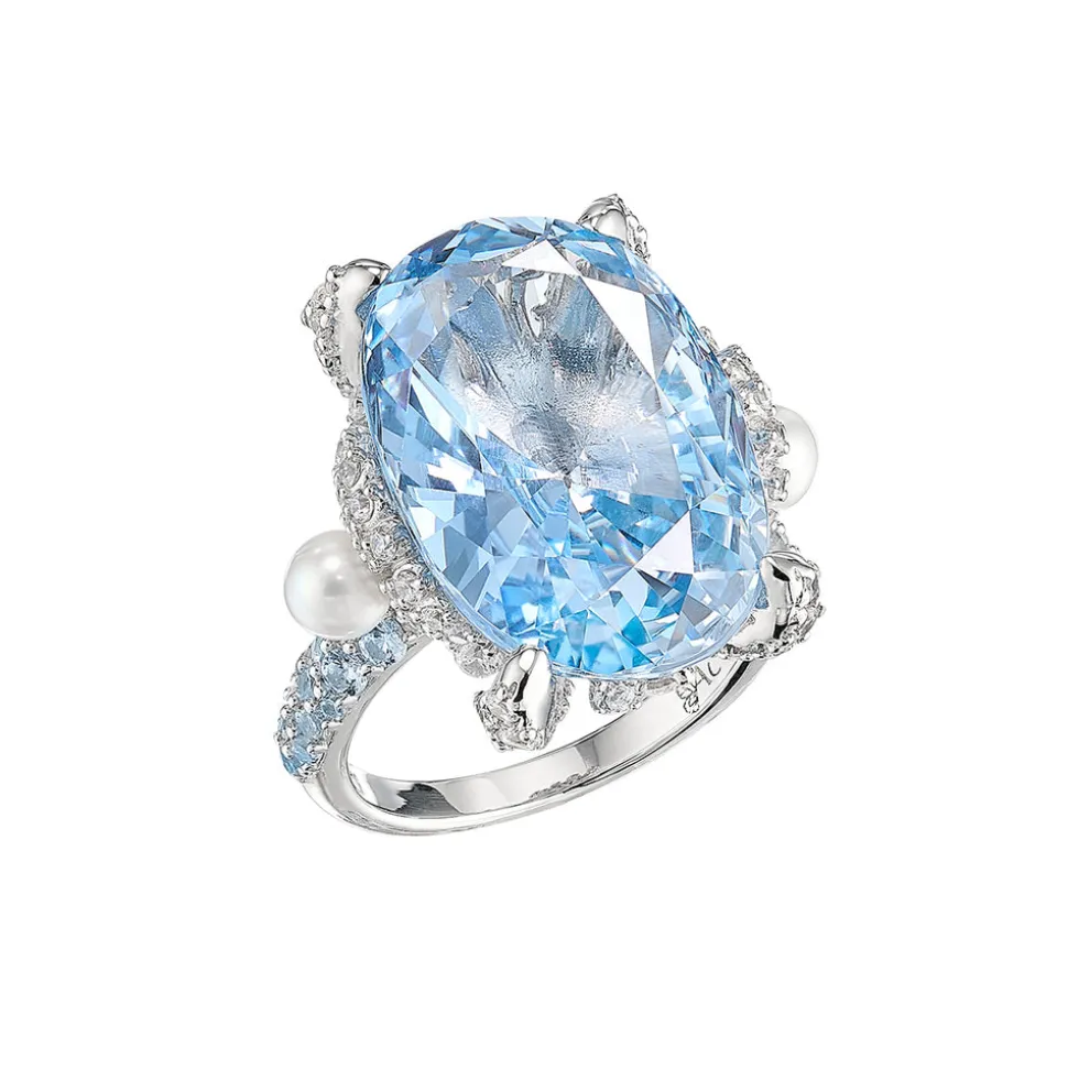 London-based Anabela Chan’s background in architecture and luxury fashion led to the first fine jewelry line to champion laboratory-grown gemstones. Today, its artisanal craftsmanship and sustainable innovations have found a place in the collections of royals, Rihanna, Taylor Swift, and sophisticated women worldwide. The Baby Blue Mermaid Ring features a breathtaking 18 carat simulated aquamarine at its center. Other stones feature pavé simulated white diamonds and cultured freshwater pearls.
