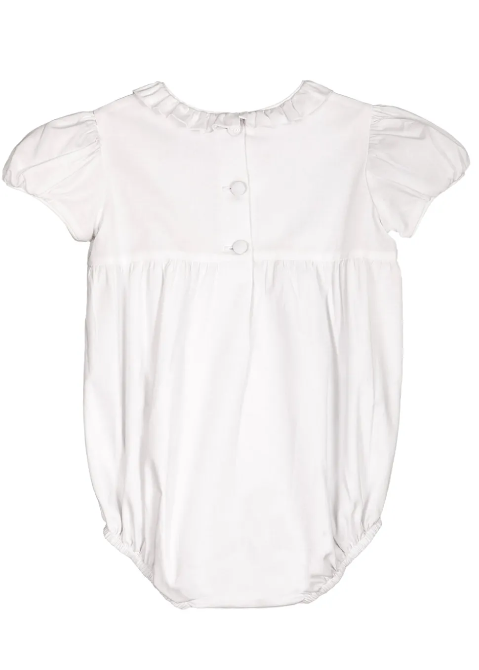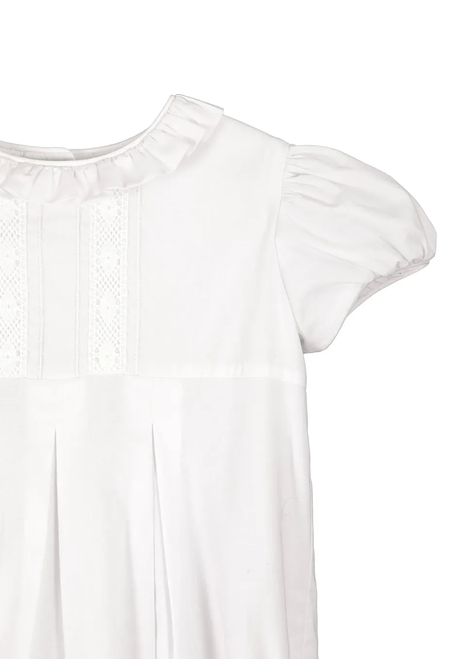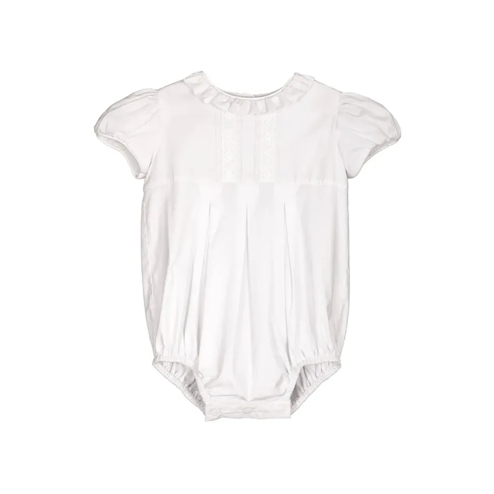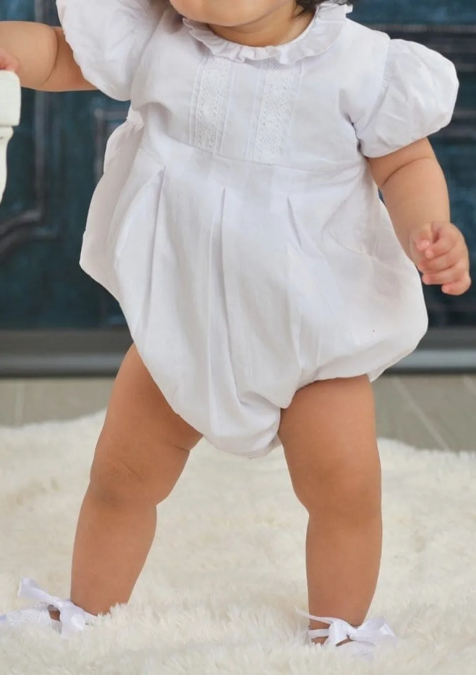Using artisan seamstresses to craft small orders of their heirloom pieces, Strasburg Children pays special attention to details—French seams, built-in slips, and fabric-covered buttons—for lasting quality and comfort. An adorable option for baptisms, family portraits or any special affair, the Baby White Bubble is crafted with extra softness and features delicate lace insets and tiny tucks. Bonus: a button crotch for easy dressing and diaper changes.