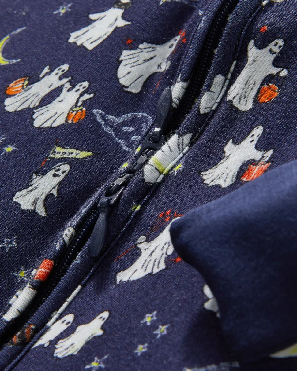Petite Plume wishes you a “bonne nuit,” and in their luxury sleepwear, it’s hard not to oblige. The Baby’s Pima Peekaboo Romper in Spooky Slumber features friendly ghosts enjoying Halloween fun and games in their own creative costumes. This snuggly one-piece is designed to cocoon little ones in buttery softness, while thoughtful details ensure lasting comfort as they grow.