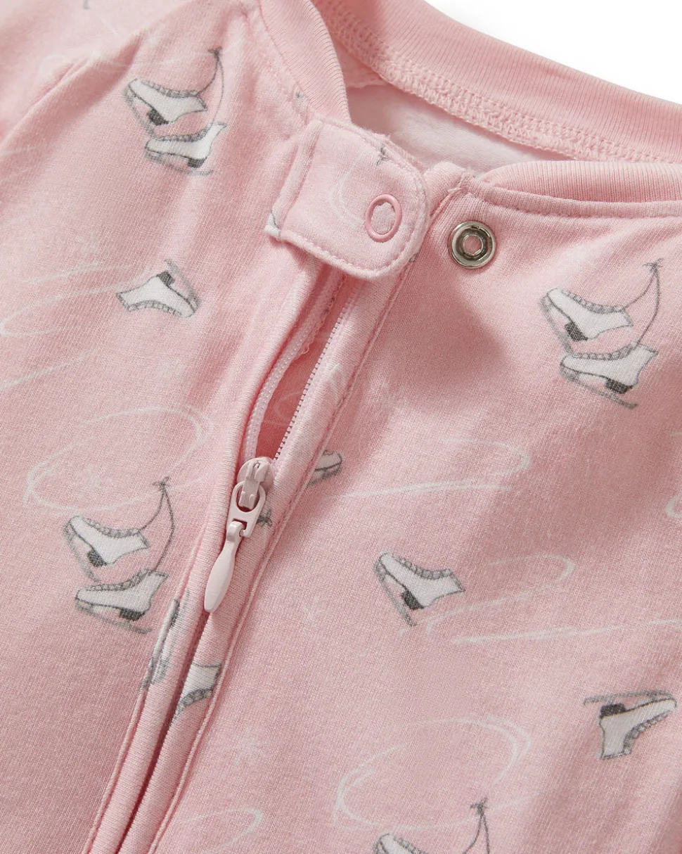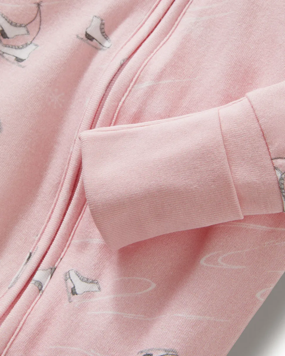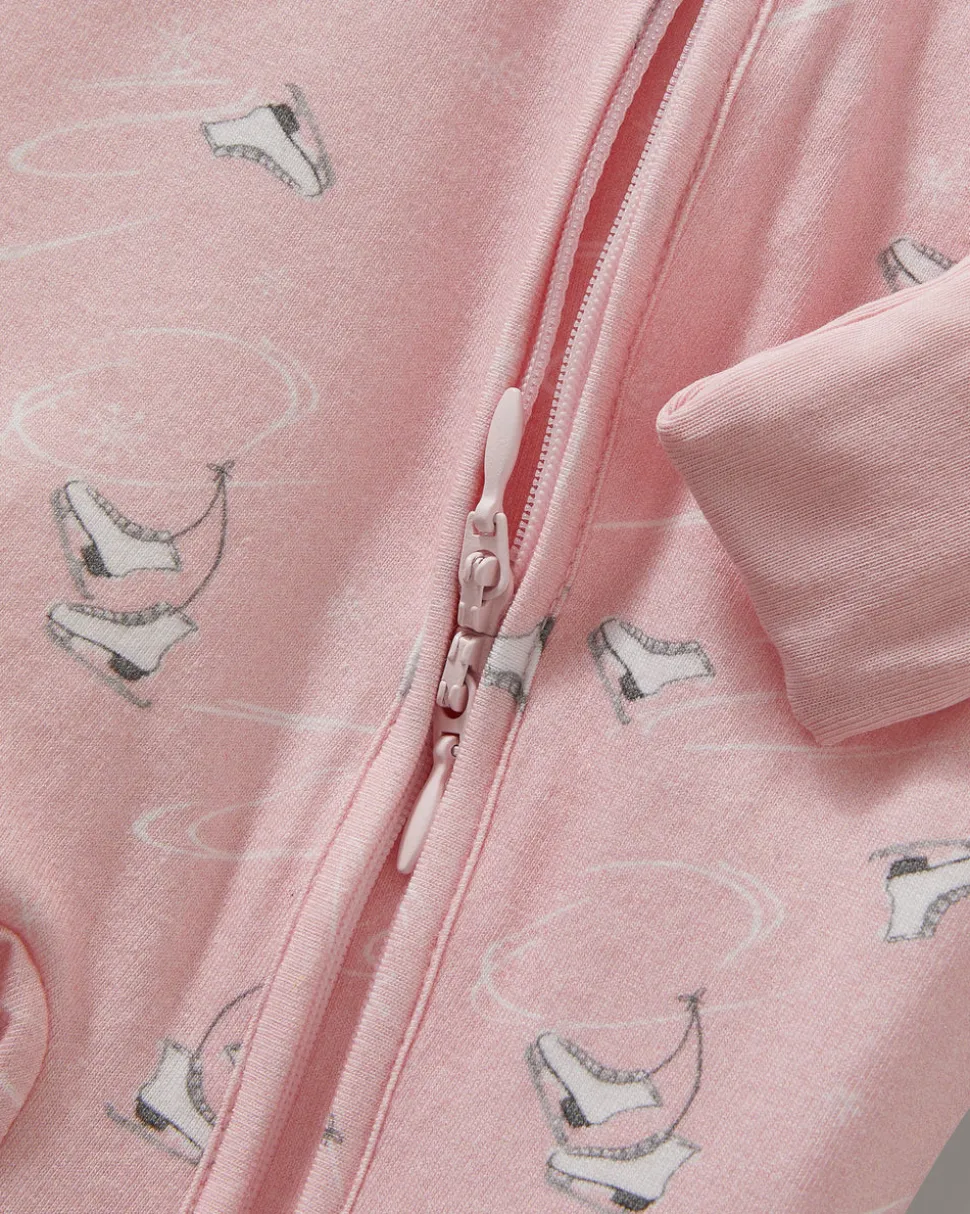 Petite Plume wishes you a “bonne nuit,” and in their luxury sleepwear, it’s hard not to oblige. The Baby’s Pima Peekaboo Romper in Winter Skates captures the whimsy of gliding across the ice, with sleek white skates dancing over a delicate pink background. This snuggly one-piece is designed to cocoon little ones in buttery softness, while thoughtful details ensure lasting comfort as they grow.