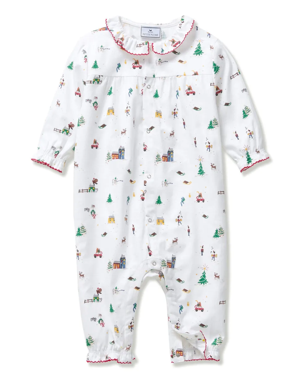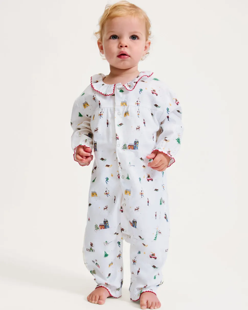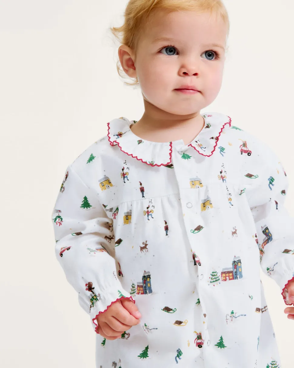 Petite Plume wishes you a “bonne nuit,” and in their luxury sleepwear, it’s hard not to oblige. With this darling romper, joyful sights of this peaceful holiday village will take you down memory lane on this seasonal print where Santa winds his way through town, while vintage cars and wooden sleighs glide past pristine wintry decorations.