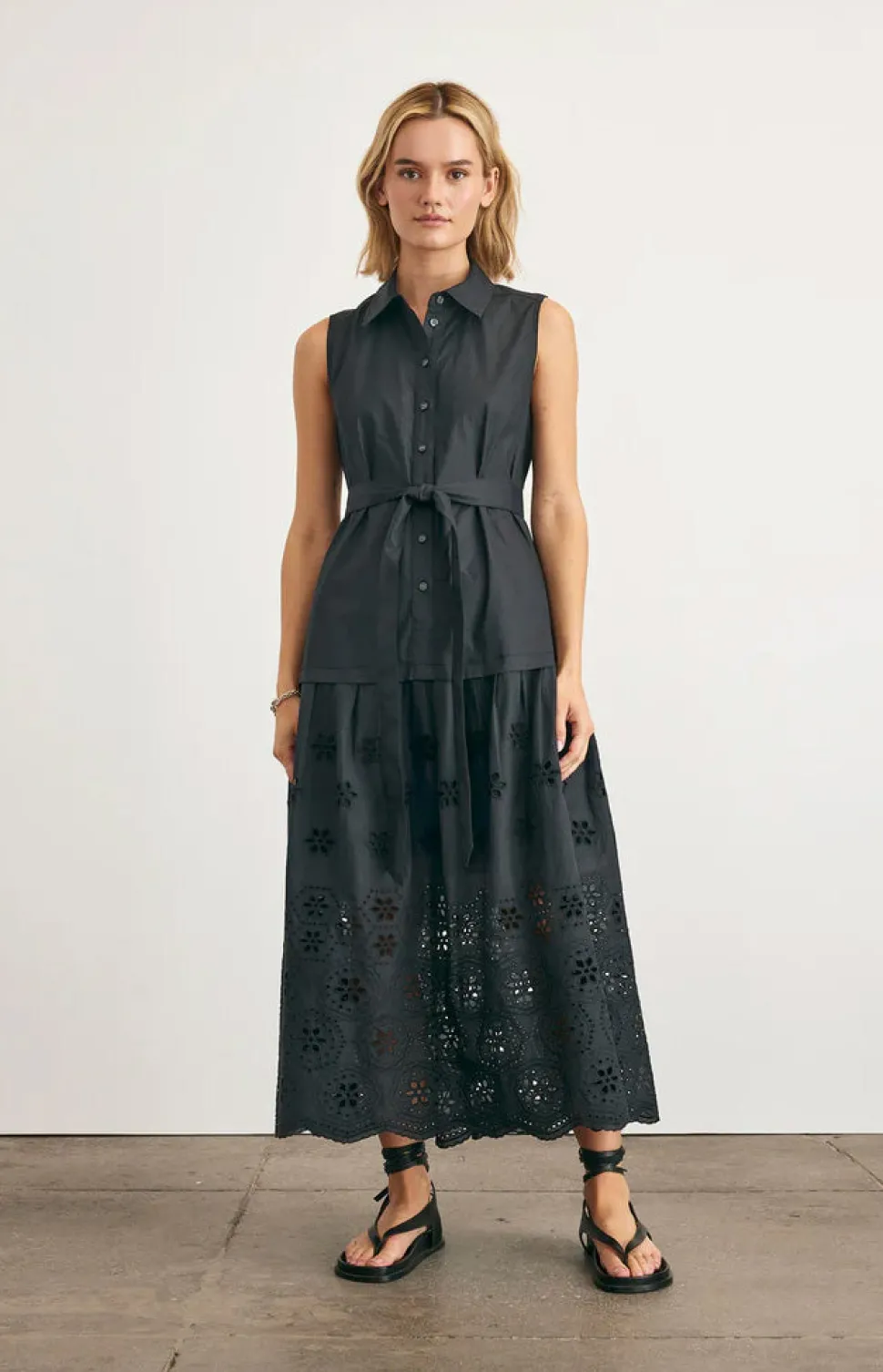 100% cotton. Midi length. Collared v-neck. Sleeveless. Lined bodice. Cotton poplin. Self tie. Embroidered cutouts at skirt. Button up.