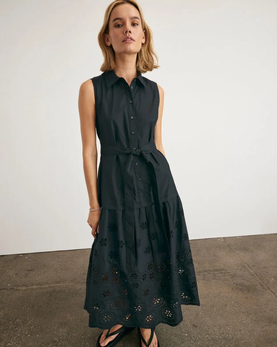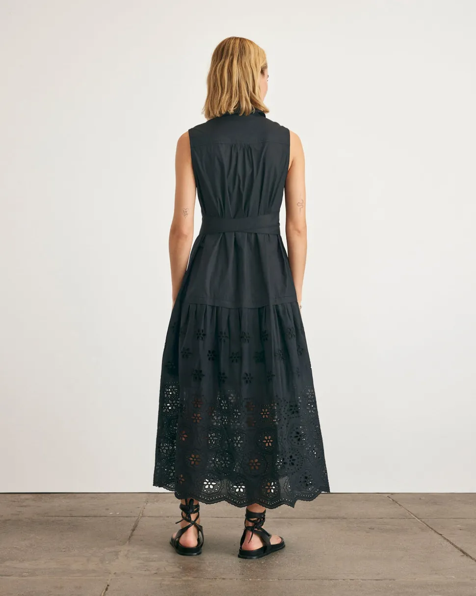 Creating clothing that inspires confidence, celebration, and community, Tanya Taylor is a New York-based womenswear brand whose mission is to provide practicality and style to a range of ready-to-wear in inclusive sizes. Each collection is thoughtfully designed through the artful use of color, texture, and original hand-painted prints. Designed in a luxe cotton poplin, the Bailey Dress in Black is a standout combo midi that blends everyday ease with elevated detail. Featuring a button up collared neckline, self tie belt, and eyelet embroidery throughout the skirt, this feminine silhouette is as easy as it is sophisticated.
