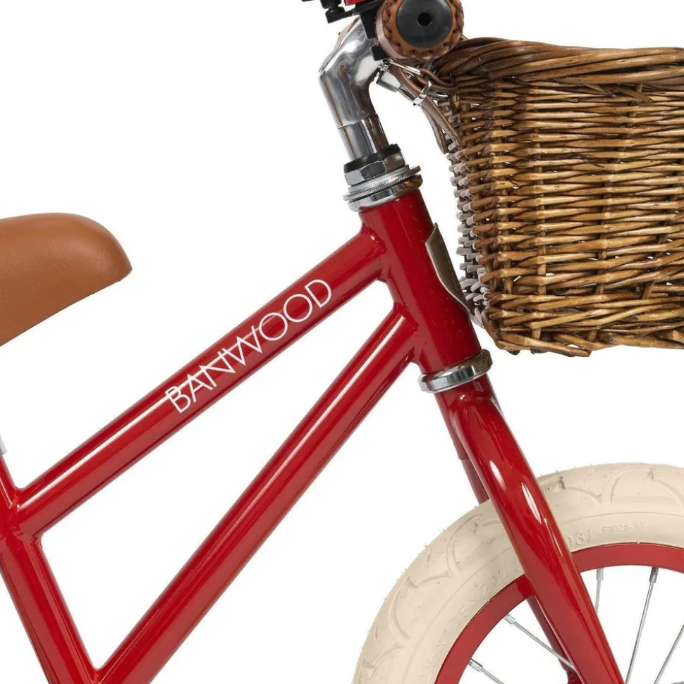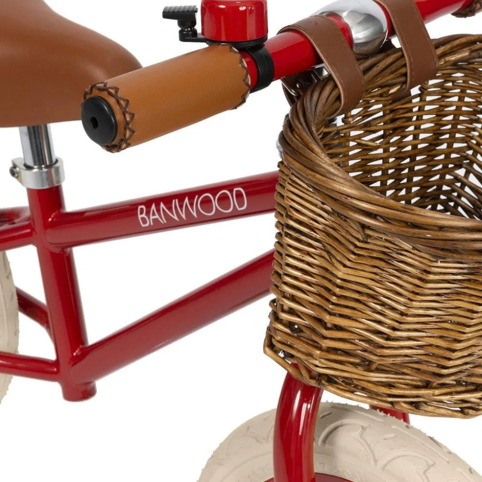 Steel frame with a red finish. 12″ wheels. Adjustable saddle and handlebars. Vegan leather grips. Detachable wicker basket. Minimal assembly required.