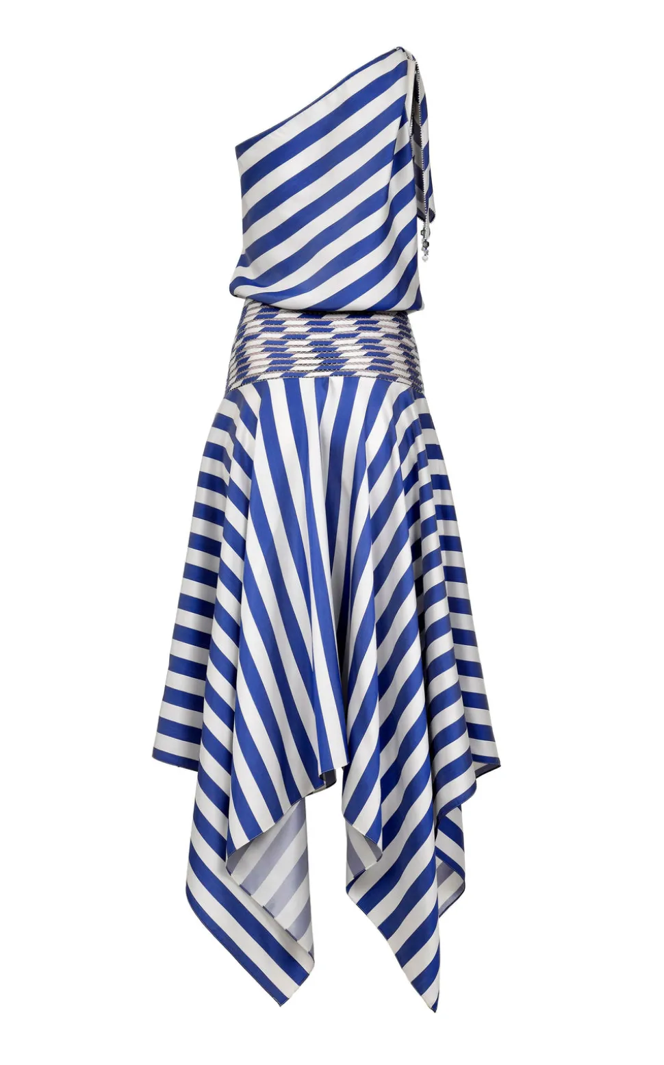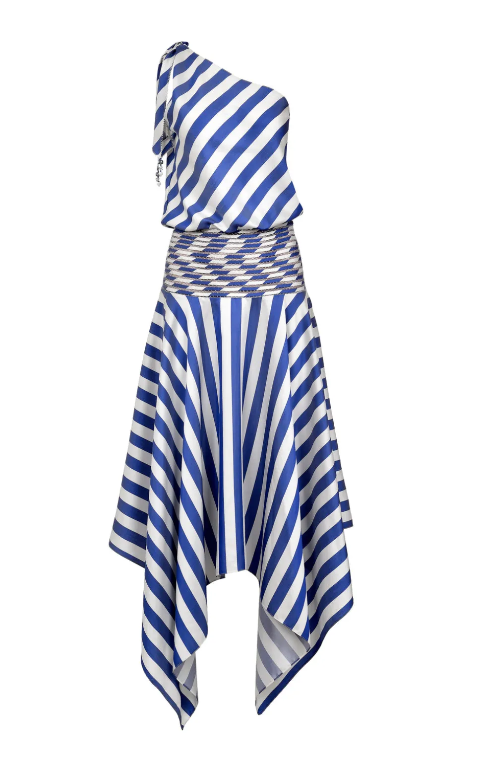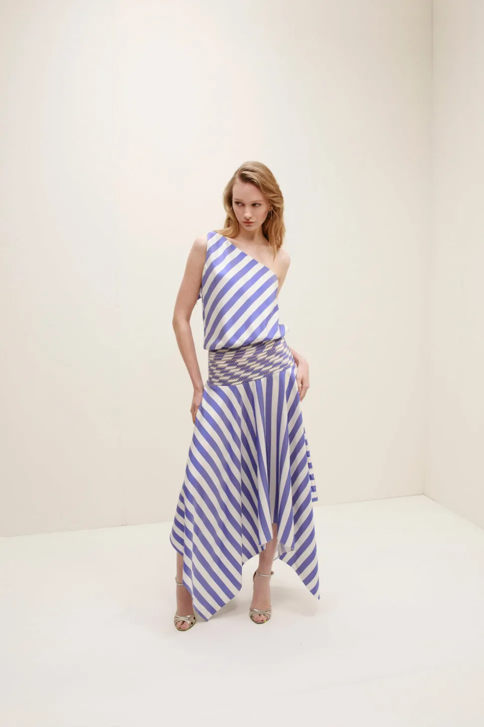From her atelier in Barranquilla, Colombia, Francesca Miranda combines the diverse, indigenous aesthetic of her surroundings, as well as her own European roots, to produce sumptuous womenswear, bridal, and household objects, each bearing the essential spirit of artistry and craftsmanship. The Banda Silk Dress blends effortless movement with bold design, featuring an asymmetrical one-shoulder neckline and a flowing, asymmetric hem. Striking diagonal stripes contrast with a woven waist detail, crafted using the intricate pata de cabra technique, adding texture and structure to this fluid silhouette.