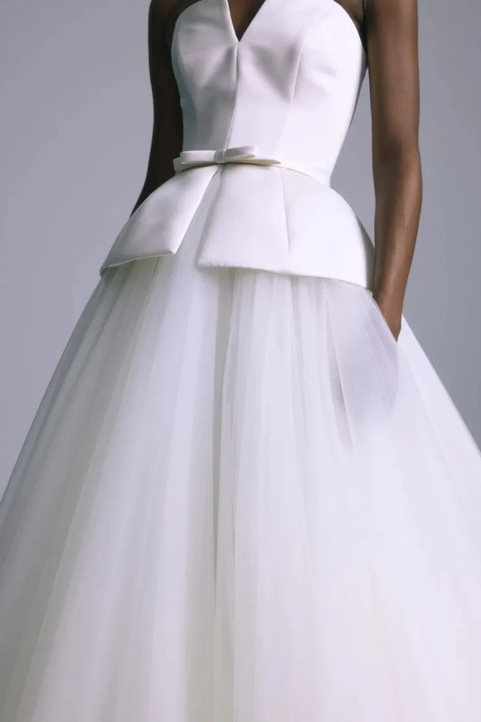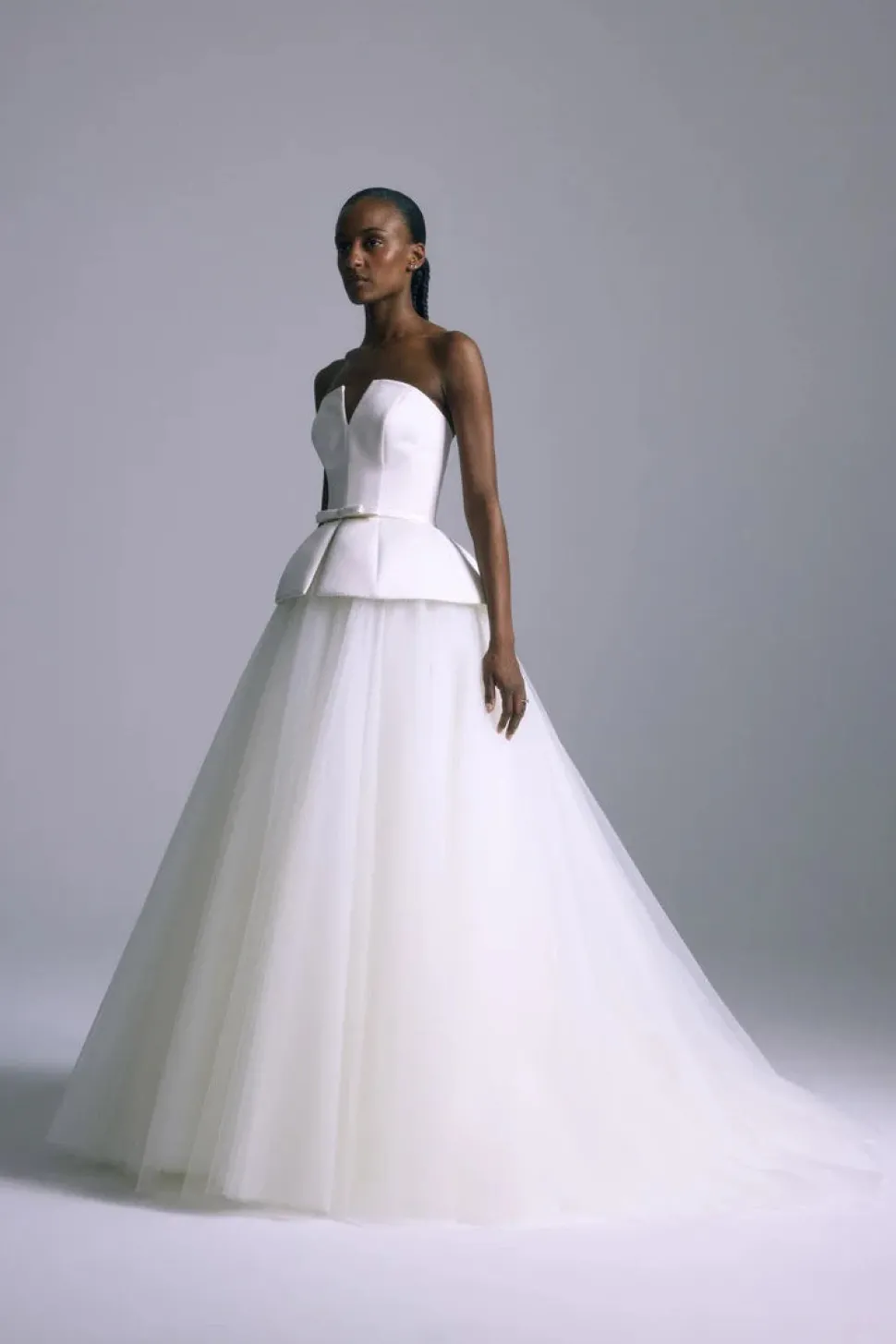 Over three decades ago, Ethiopian-born Amsale Aberra began crafting modern, personalized wedding dresses, beginning with her own. Today, her distinct bridal gowns—handmade with couture techniques in AMSALE’s New York City atelier—share their tasteful femininity, unstated glamour and attention to detail with sophisticated women the world over. The Banks Corset Gown is an Italian double faced duchess satin dress with a corset peplum and elegant tulle skirt.