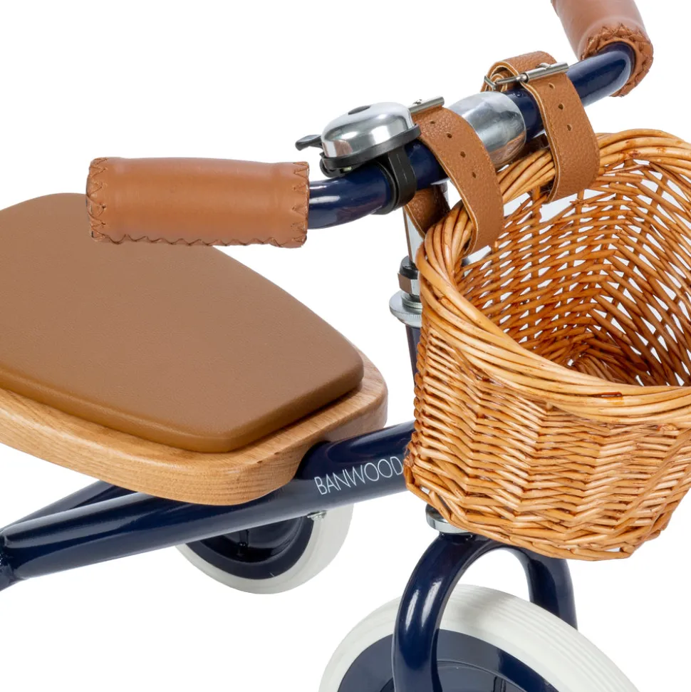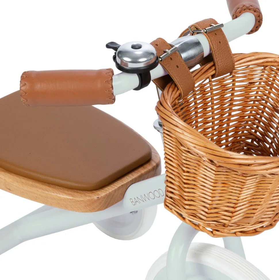 Frame: steel with colored finish. Seat: oak wood with soft padding in vegan leather, including front wicker basket. Bell. Removable push bar. Adjustable handlebar height: from 45-50,5 cm. Seat height: 30 cm.