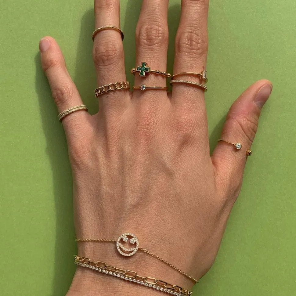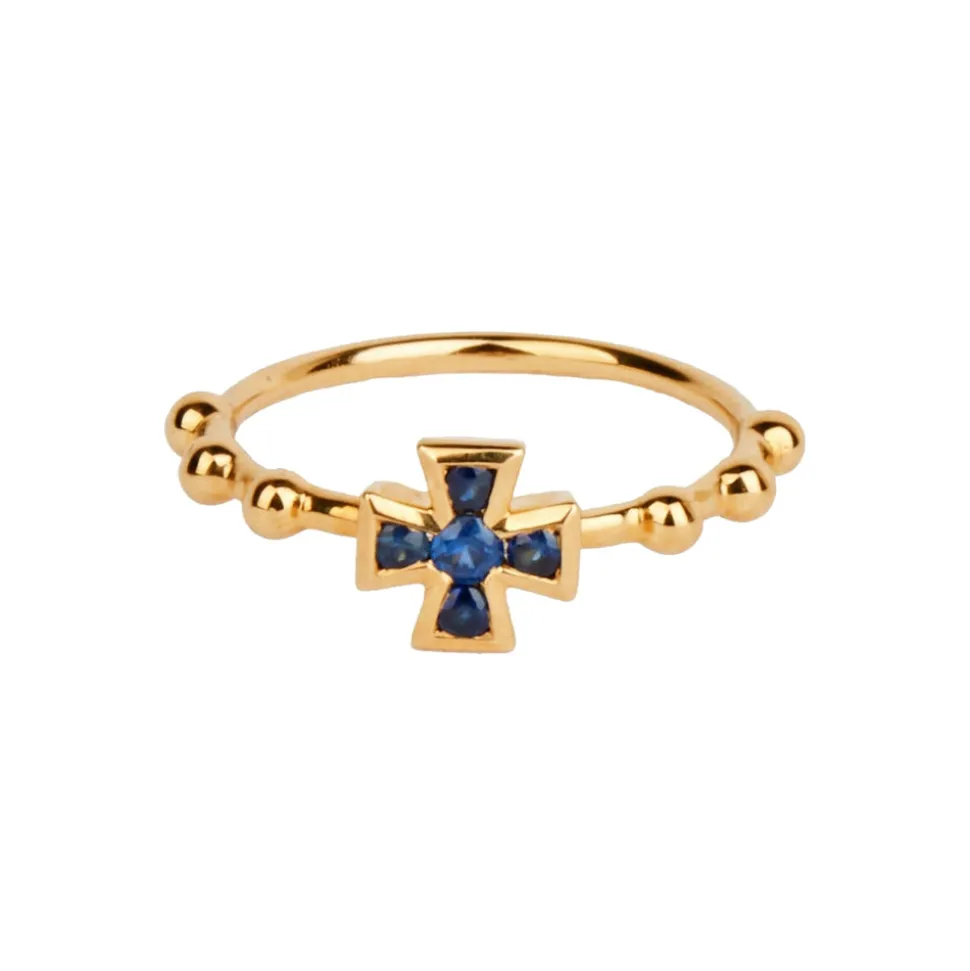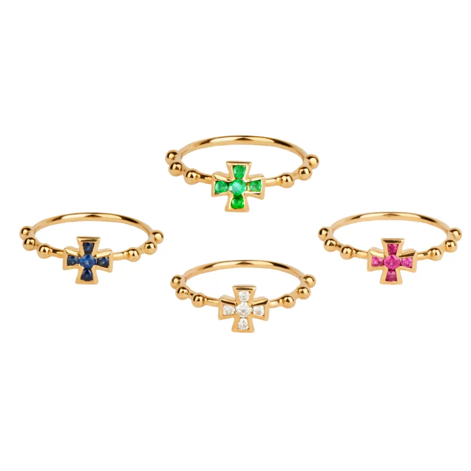 A partnership between Rosa de la Cruz and Tierney Horne, this jewelry line ties together the worlds of fashion and art with collections set to appeal across generations, and with other pieces. Inspired by vintage jewelry, as well as contemporary and modern art, these minimalist pieces spark creativity and joy, and celebrate singular style. An ornate St. George’s cross, in sapphire, emerald, ruby or diamond, adorns this simply stunning ring.