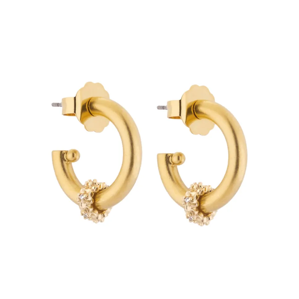 Hand-made. Featherweight. Crystal-studded flower ring. 24k antique gold-plated OG hoops. Stainless steel hypoallergenic posts.