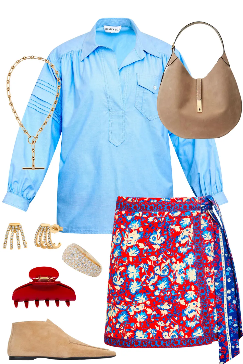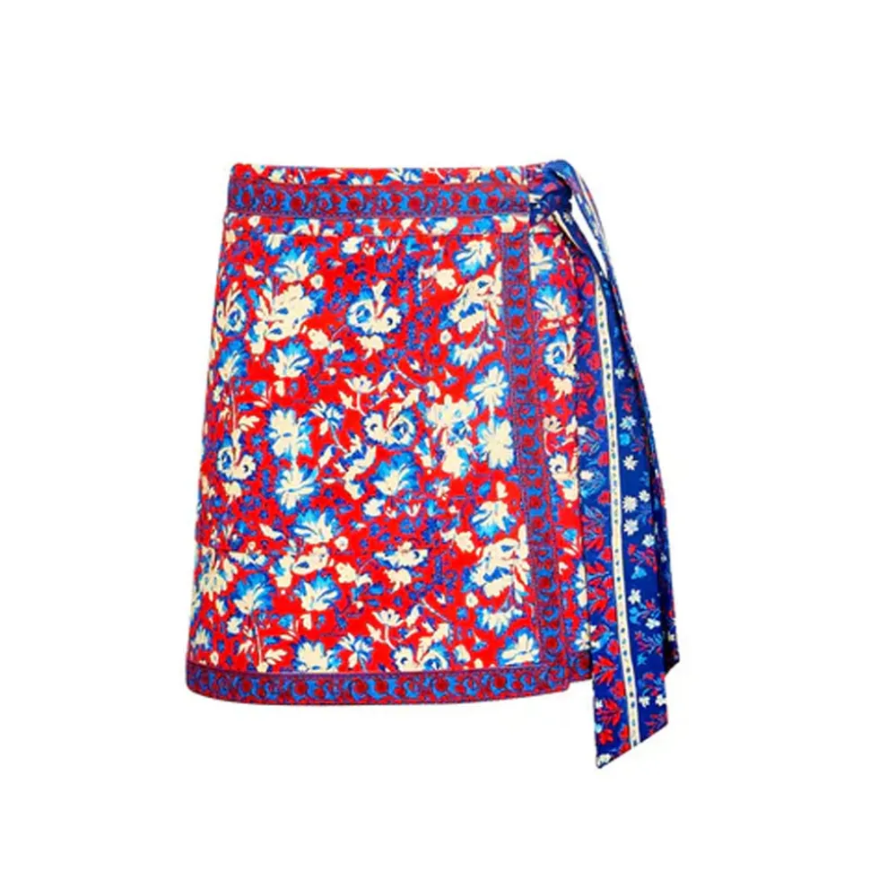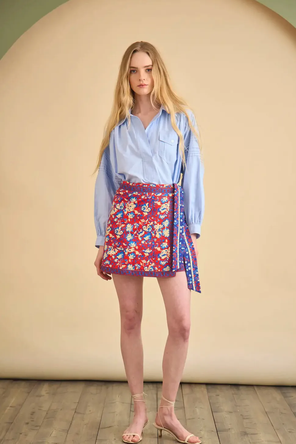 Hunter Bell brings joyful, polished pieces to life with a distinctive mix of bold pattern, thoughtful tailoring, and feminine charm. Back by popular demand and now refreshed in a vibrant print, the Bay Skirt in Tapestry Floral offers a flattering wrap-style mini silhouette with just the right mix of structure and charm. Crafted from cotton faille with a subtly textured weave, it features all-over trim detailing for a refined finish. Whether styled with a crisp shirt or a graphic sweatshirt, this standout piece effortlessly bridges playful and sophisticated style.