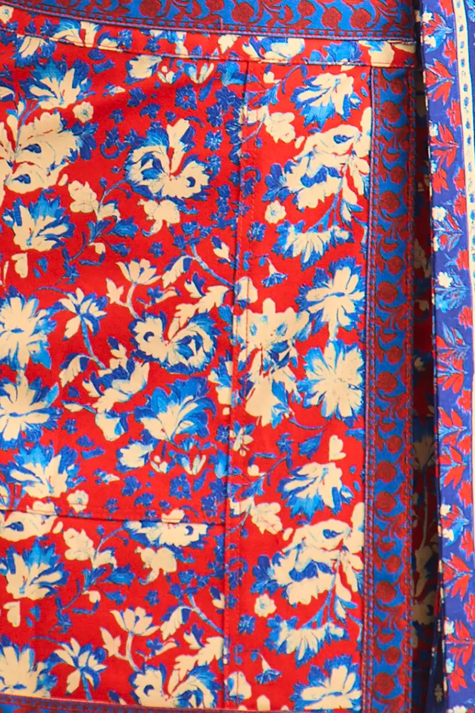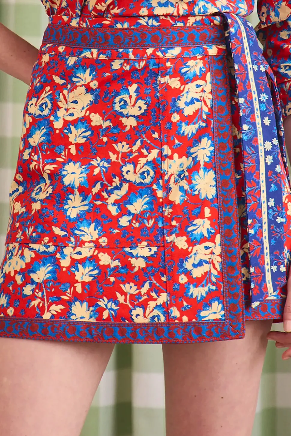 100% cotton faille. Wrap-style mini skirt. Trim border throughout. Tapestry Floral print. Structured yet breathable fabric. 16″ from top of waistband.