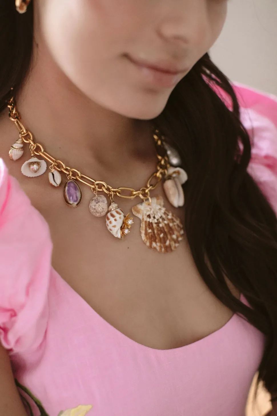 Hand-made. 24K antique gold-plated chunky brass chain. Assortment of authentic natural shell charms. Freshwater pearls set in 24K antique gold-plated brass flowers. Adjustable. Hook closure. Please note that no two shells or semi-precious beads are exactly the same; they range slightly in color and detailing due to being natural materials. Each shell has its own unique markings and there will be slight variations due to the individuality of each piece.