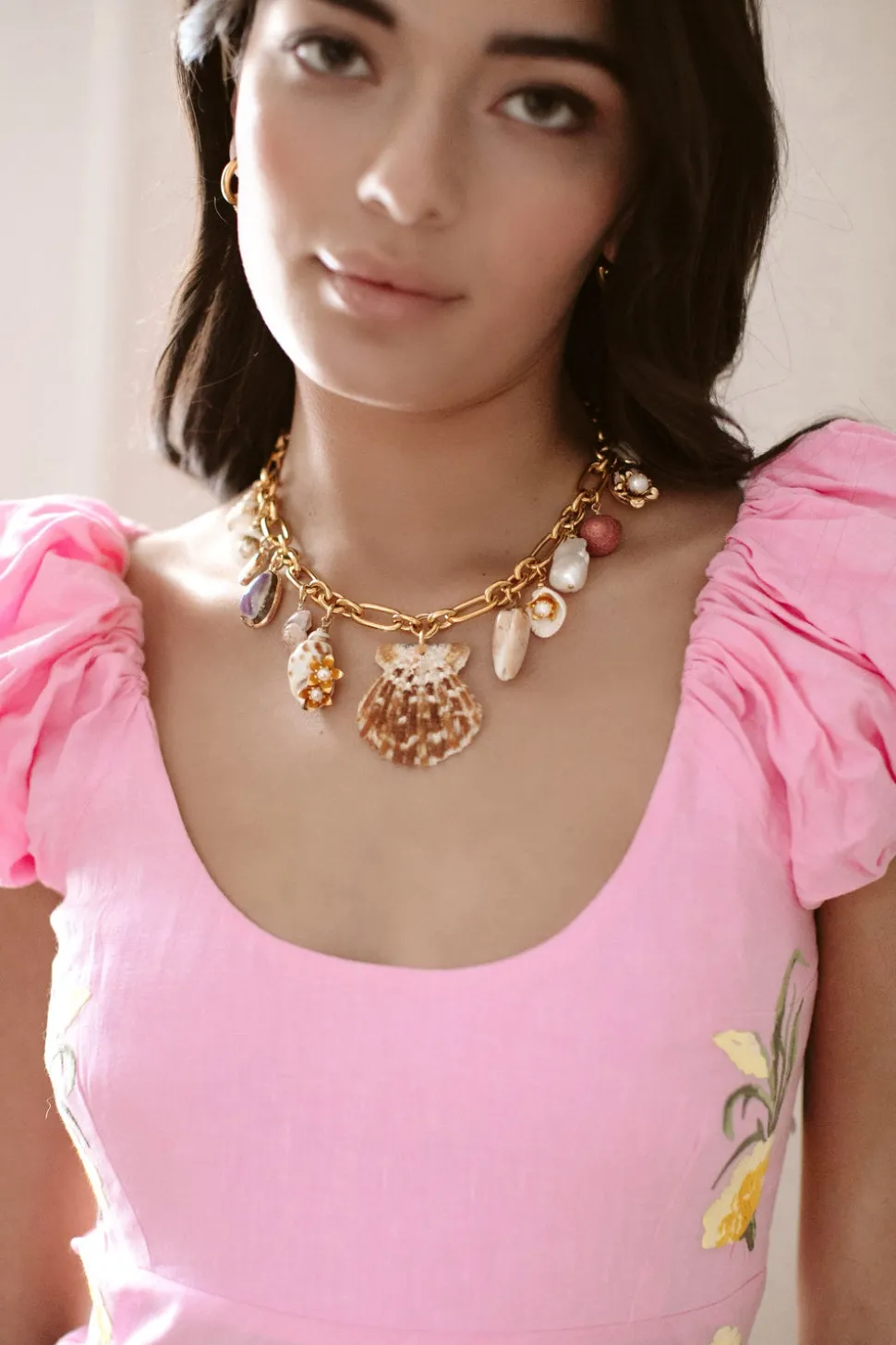 The mother-daughter duo behind Brinker + Eliza combine their experience in metalsmithing and fashion to create incredibly unique jewelry that feels custom-made. Employing pearls, shells, and earth’s most prized organic forms, these are pieces to be not just worn but treasured. The Beach Bound Necklace is ready for vacay. The chunky chain features assorted natural shell charms, freshwater pearls and 24K antique gold-plated brass flowers. The chunky chain is easily adjustable.