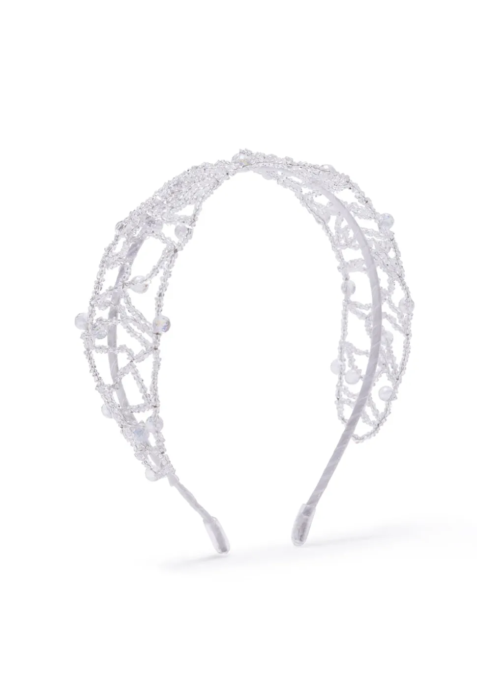 Appreciation for quality materials and strong integrity to design and workmanship are the main principles behind Emm Kuo. Architectural influences, strong textural contrasts, and clean shapes render the entire collection modern yet classic. The Beaded Lace Headband in Clear is a romantic piece featuring enchanting weavings of beads mimic a spiderweb dusting your head like a crown. The crystals illuminate when under light, bringing a gentle glow to your face.