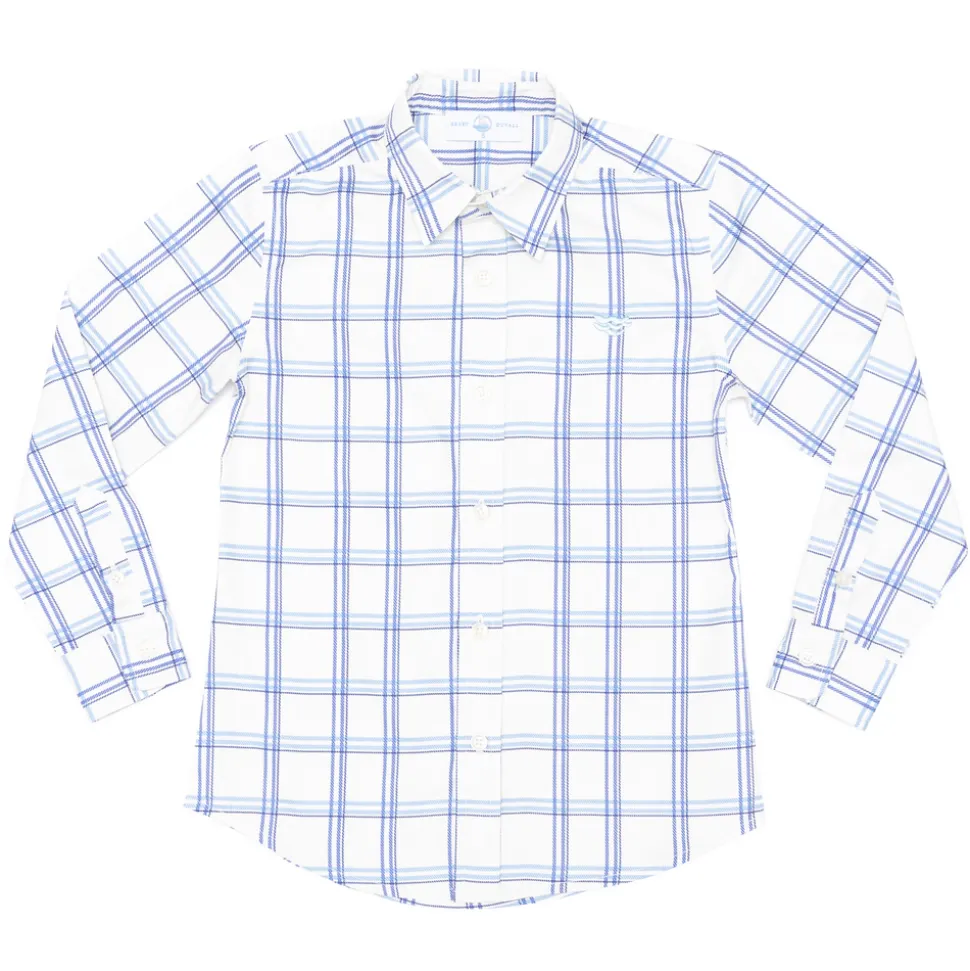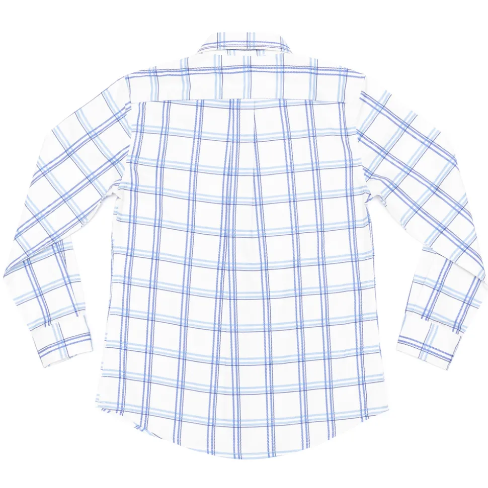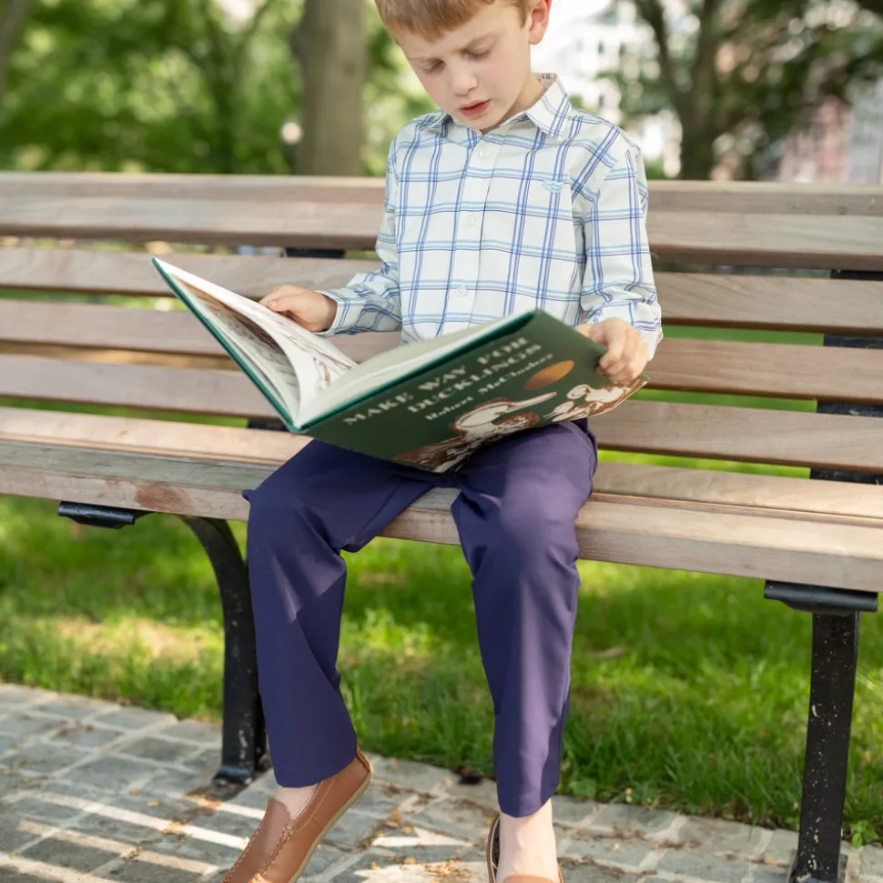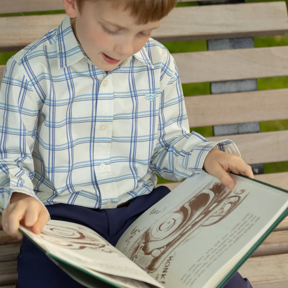 A celebration of the spirit of boyhood, the updated classics from Henry Duvall are curious, imaginative, and sweet. Full of character and playful details, these are easy-to-care-for clothes that families will love. Classic and crisp, the Bennett Button Down makes a refined statement this fall in Prescott Plaid—a clean, structured check in timeless ivory and blue. With a tailored collar and polished silhouette, it’s a versatile shirt that transitions effortlessly from special occasions to seasonal family outings. Wear it tucked into the Bradford Trousers or Robert Shorts in Back Bay Blue Velvet for a timeless look, or layer it under a Christopher Sweater for a cohesive fall ensemble. The Bennett is designed with comfort in mind and finished with elevated detailing for a look that’s both traditional and easy to wear. Mix and match with Back Bay Blue Velvet or Prescott Plaid styles across the collection for refined sibling coordination.