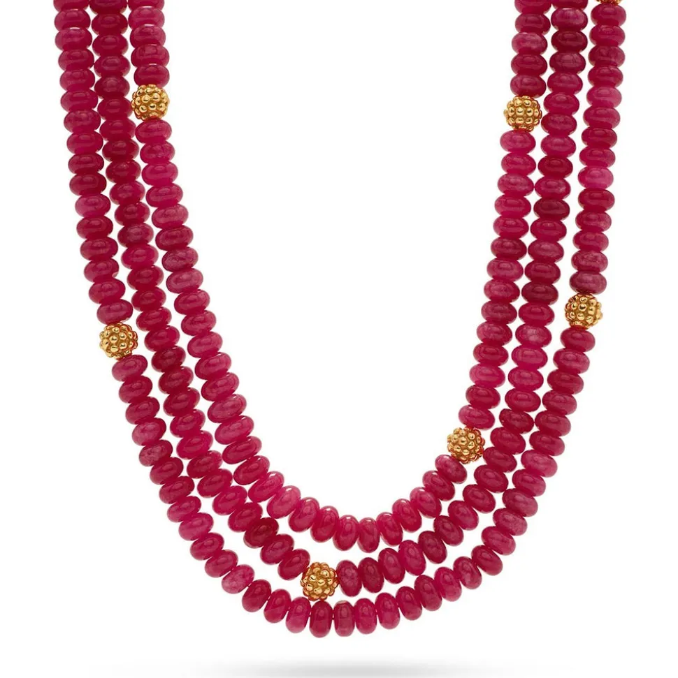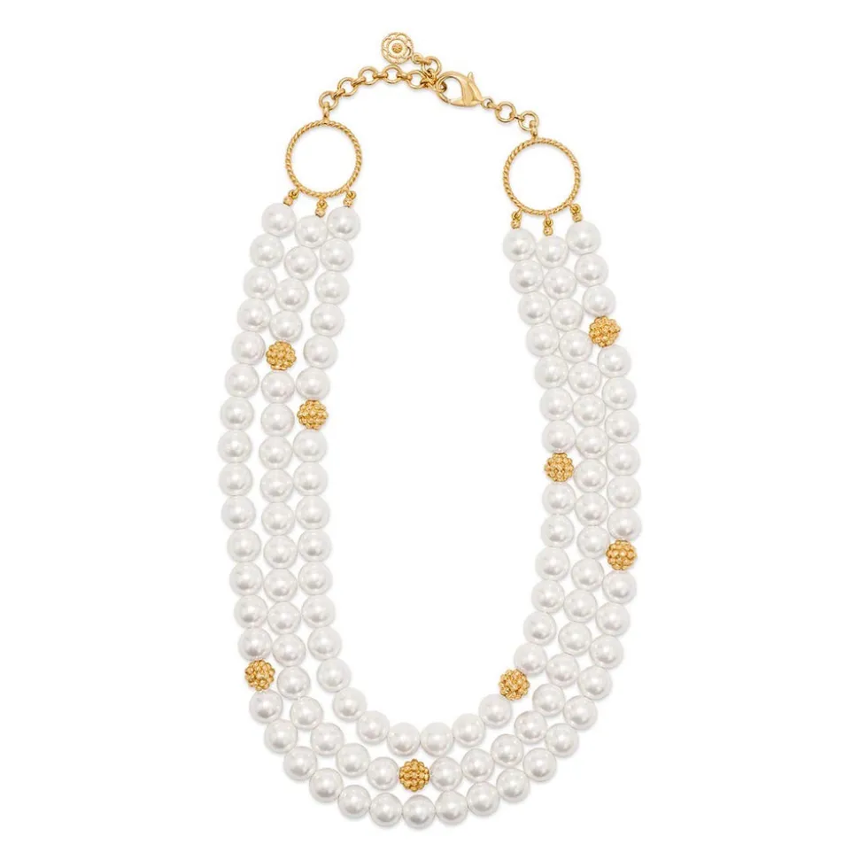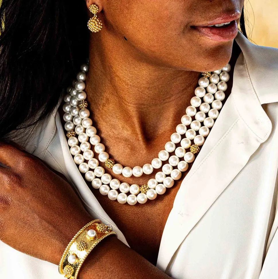 Half-Parisian, half-Texan, Capucine De Wulf’s unique upbringing was the inspiration for her namesake jewelry line. Her accessories combine French romance with an American sensibility. Simultaneously decadent and earthy, this triple-strand statement piece sings with any outfit, for any occasion, with its ropes of polished beads. Exquisitely finished with bright gold details, from the intricate clasp and dotted with a sprinkling of gilded berries throughout.
