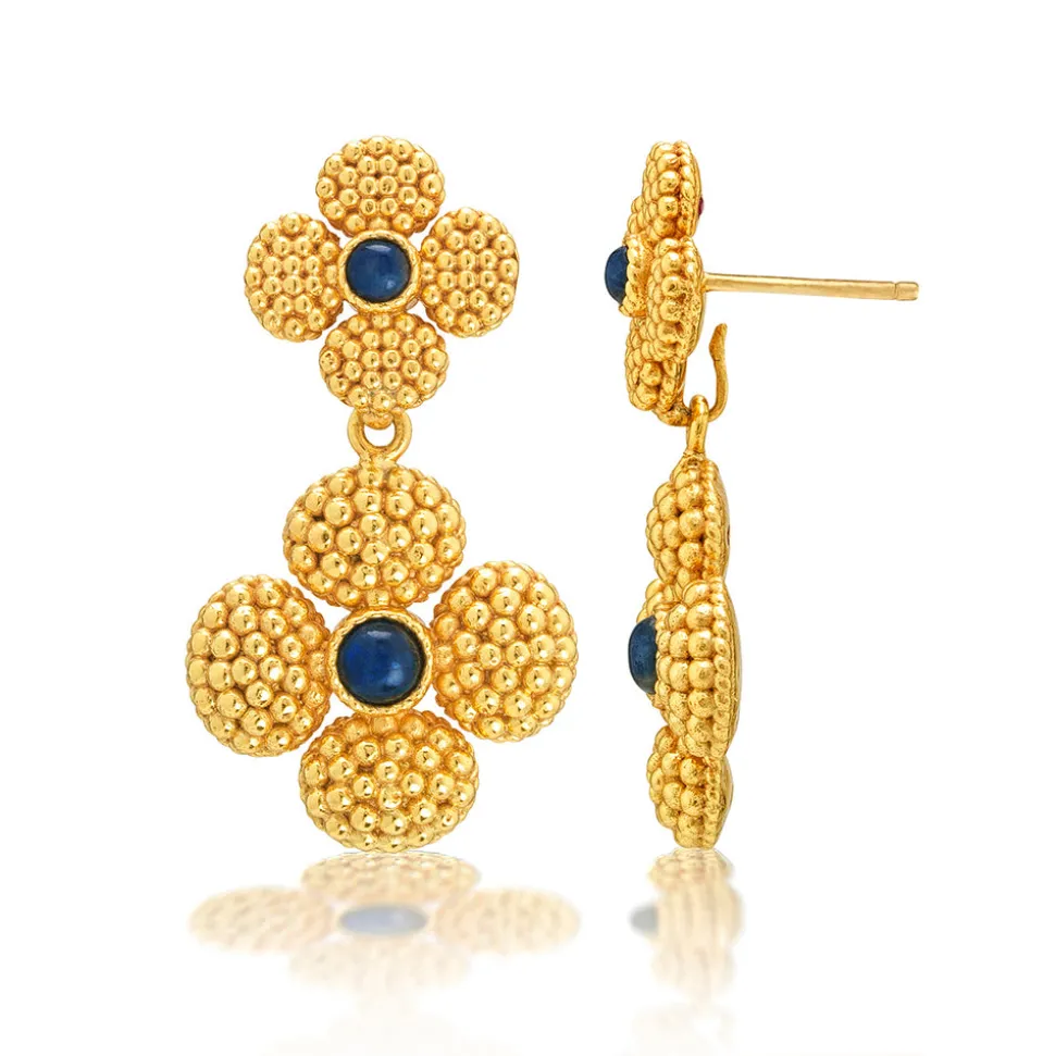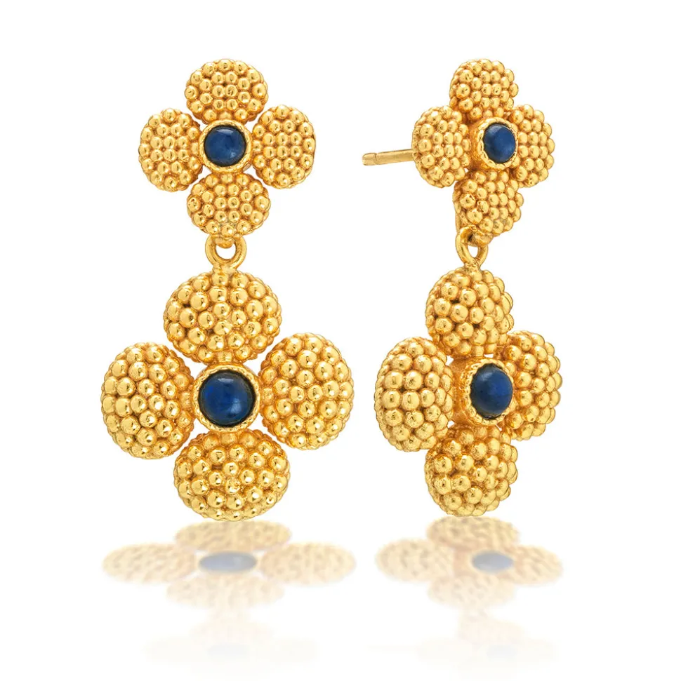 Half-Parisian, half-Texan, Capucine De Wulf’s unique upbringing was the inspiration for her namesake jewelry line. Her accessories combine French romance with an American sensibility. The Berry Clover Convertible Duo Earrings in Blue Labradorite feature signature golden berries clustered into four-leaf clovers, designed as timeless tokens of luck. Centered with luminous blue labradorite gemstones, this elegant pair converts effortlessly from drops to simple studs—offering two refined looks in one.