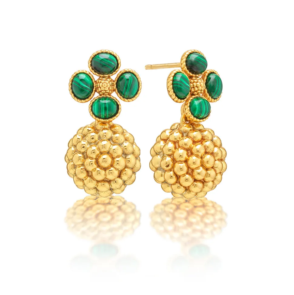 Malachite, 18K gold over brass with anti-tarnish coating. Lead-free. Nickel-free.