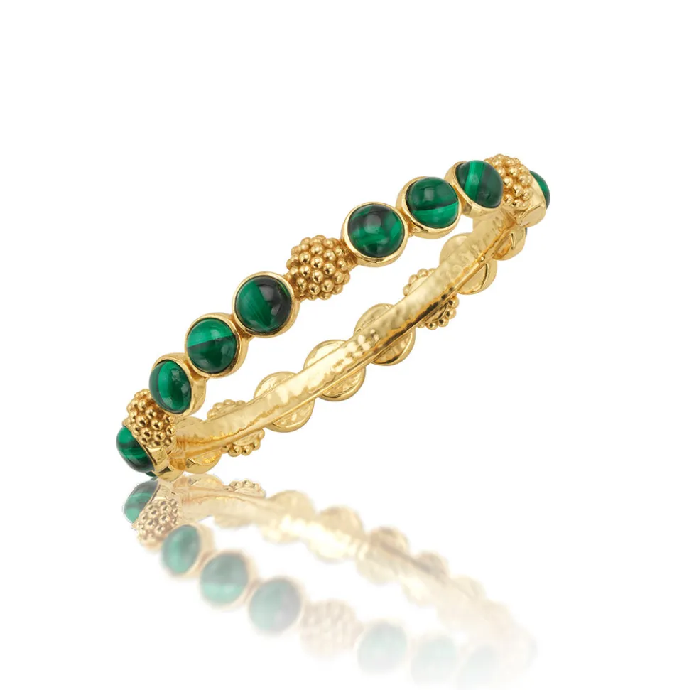 Half-Parisian, half-Texan, Capucine De Wulf’s unique upbringing was the inspiration for her namesake jewelry line. Her accessories combine French romance with an American sensibility. The Berry Gem Hinged Bangle in Malachite showcases trios of striking green malachite gem-drops interspersed with golden berries, blending regal sophistication with everyday ease. Whether worn solo or stacked, this radiant bracelet adds a hint of glamour and grace to everything from denim to tailored suiting.