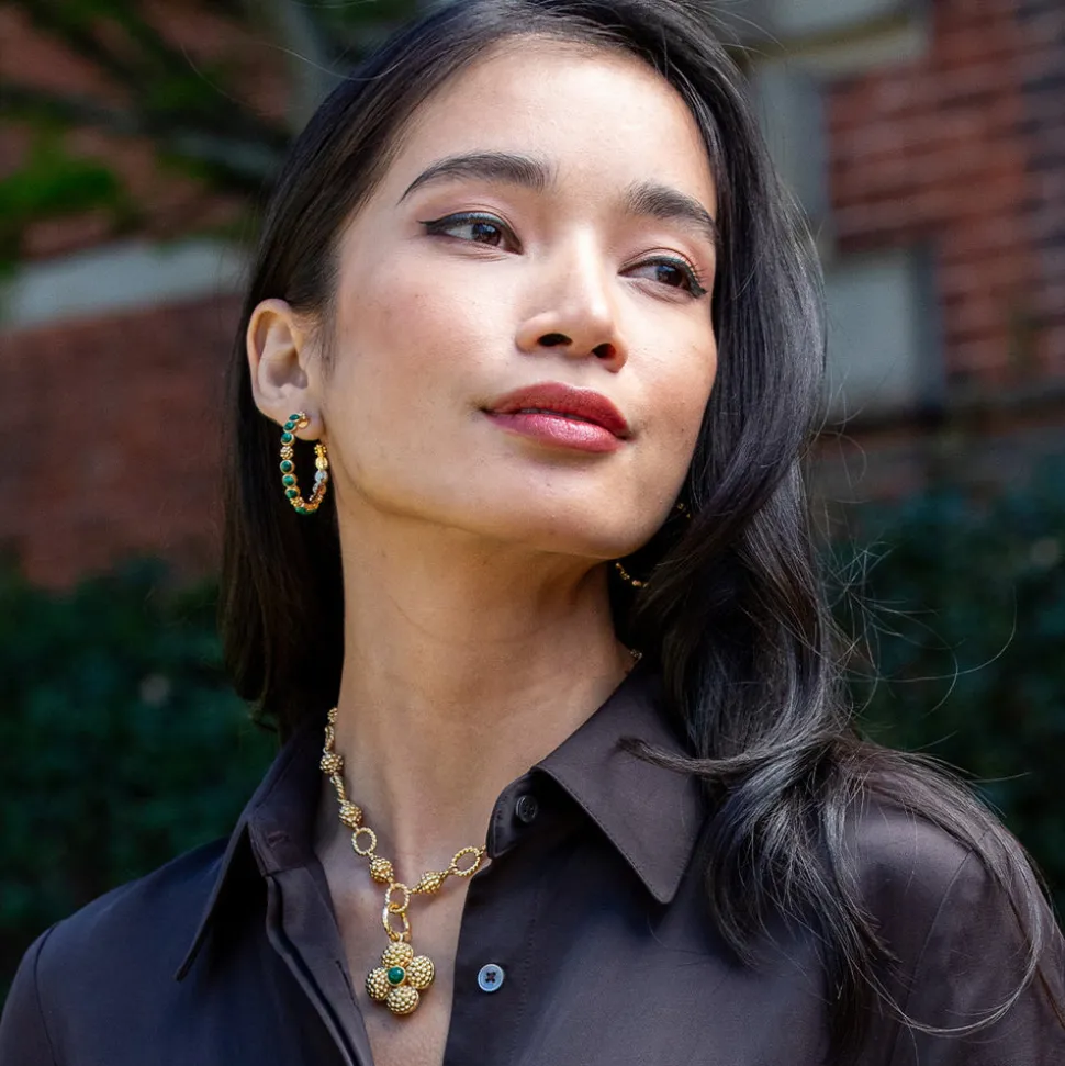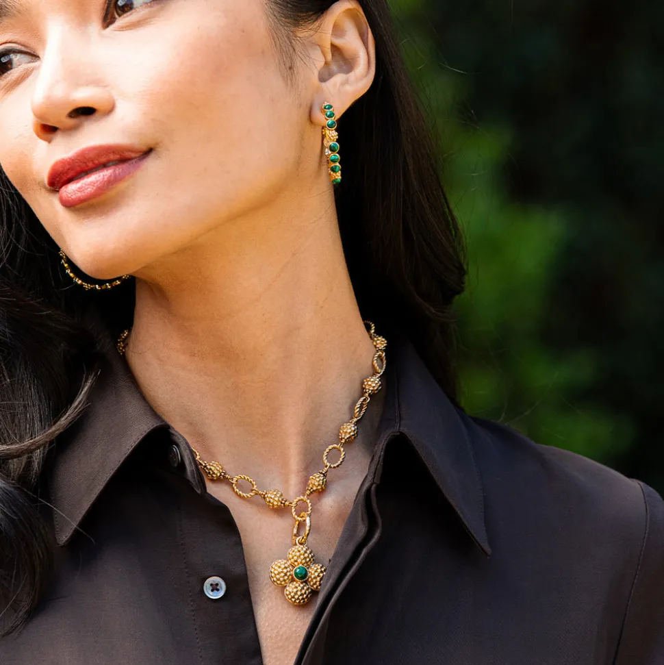 Half-Parisian, half-Texan, Capucine De Wulf’s unique upbringing was the inspiration for her namesake jewelry line. Her accessories combine French romance with an American sensibility. The Berry Gem Medium Hoop Earrings in Malachite feature classic gold hoops embellished with lustrous clusters of green malachite and delicate golden berries. Polished and feminine, they bring a sophisticated flourish to any occasion—from morning meetings to candlelit soirées.