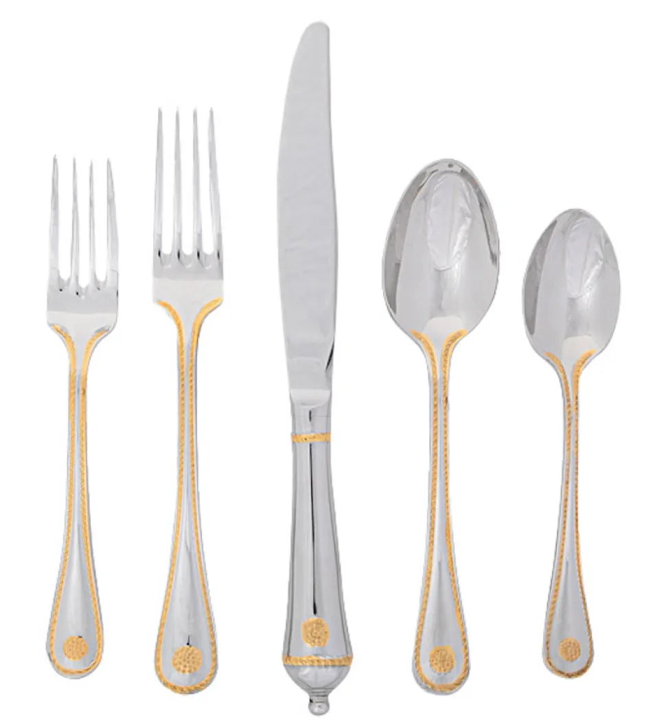 As newlyweds and self-proclaimed romantics, Capucine and David Gooding founded Juliska in 2001 with a small collection of mouth-blown Bohemian glasses. Today, it’s the tableware and home brand every good hostess needs to know. Trimmed in delicate 24-karat gold accents and crafted in the spirit of old world French tradition, the Berry & Thread 20-Piece Place Setting in Bright Satin with Gold is of optimum weight in-hand. Featuring a decorative motif on both front and back and hand rubbed with care to a warm luster finish, it’s the essence of rustic and refined style.