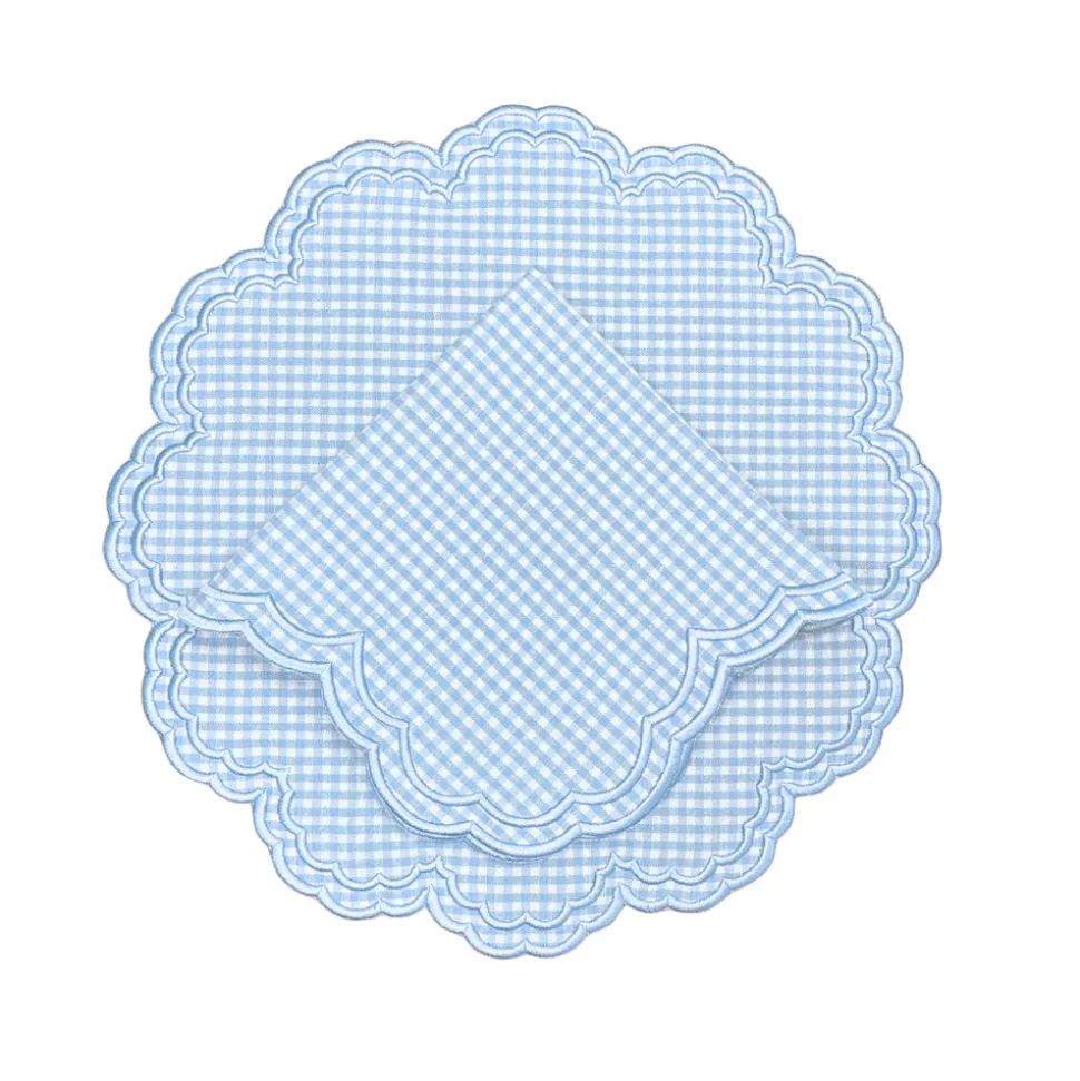 Swiss linen, fine cotton, and tasteful refinement define Flying Sheep Country’s linens and tabletop items. Founded by two sisters who spent their youth spotting sheep in the English countryside, the brand celebrates both luxury and whimsy in its vibrant prints, exceptional embroidery, and traditional artisanship. The Bettina-Gingham Napkin in Blue, Set of 4 boasts a classic plaid pattern, and is delicately embroidered with white trim and dots.