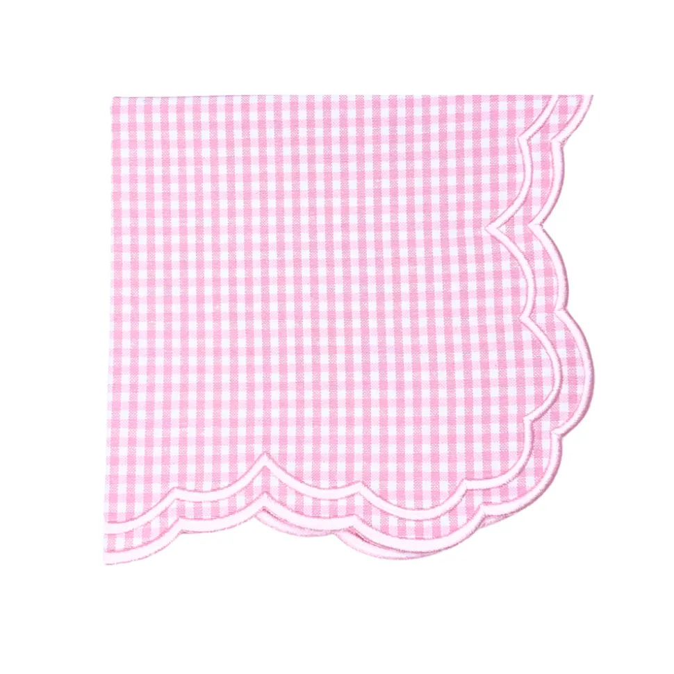 Swiss linen, fine cotton, and tasteful refinement define Flying Sheep Country’s linens and tabletop items. Founded by two sisters who spent their youth spotting sheep in the English countryside, the brand celebrates both luxury and whimsy in its vibrant prints, exceptional embroidery, and traditional artisanship. The Bettina-Gingham Napkin in Pink, Set of 4 boasts a classic plaid pattern, and is delicately embroidered with white trim and dots.