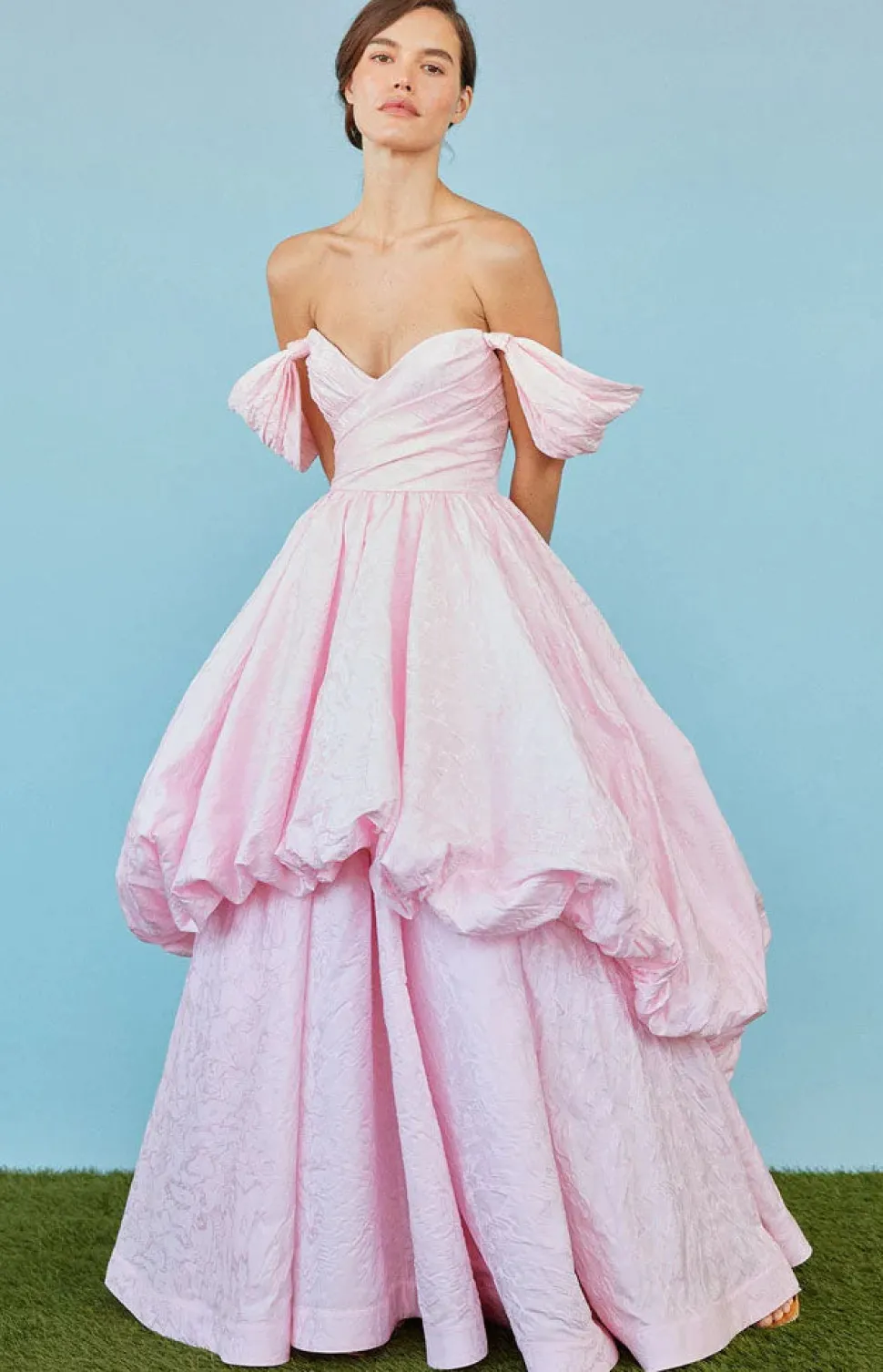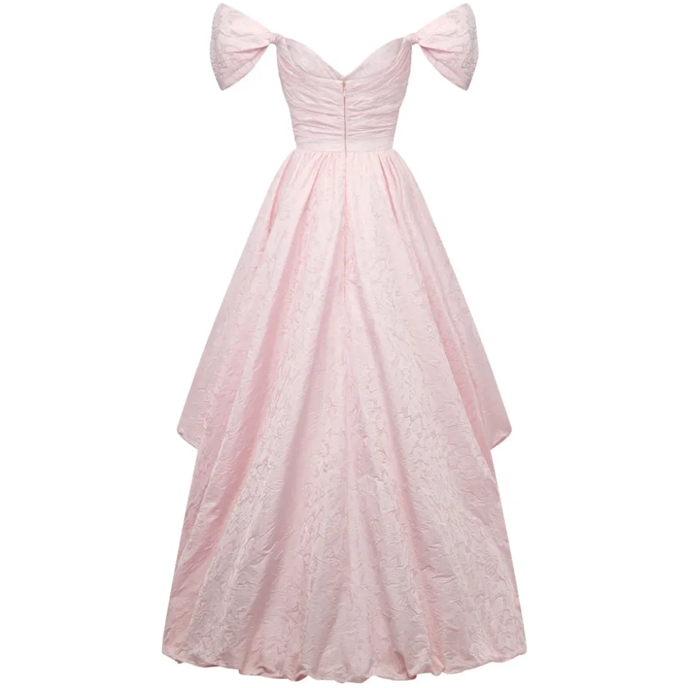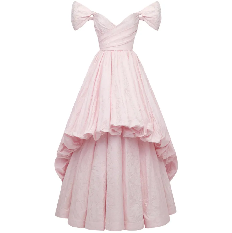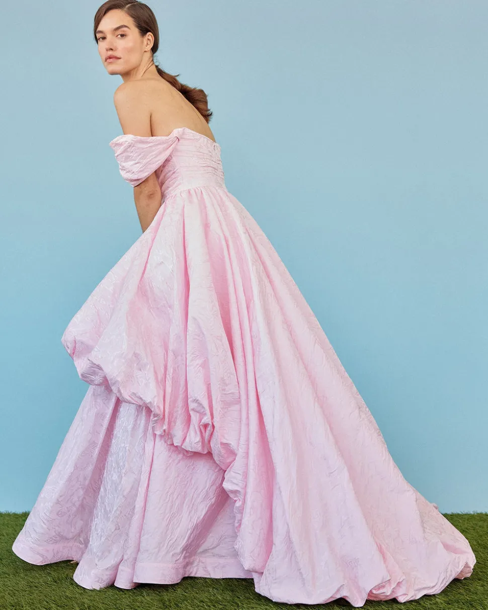 A graduate of the Savannah College of Design, award-winning Alexandra Pijut’s namesake line arrives from her studio in New York, offering luxe ready-to-wear pieces that distinguish themselves between femininity and practicality. The brand’s spring collection, “Picnic in Jaipur,” is inspired by the vibrant, maximalist colors and patterns of Villa Palladio. The Bettina Gown in Orchid Jacquard Taffeta offers a touch of old-world glamour with its asymmetric, bubble hem train and knotted off the shoulder sleeves. Cut in an orchid pink jacquard taffeta, this gown features boning through the corseted bodice and a full petticoat to create its A-line skirt shape.