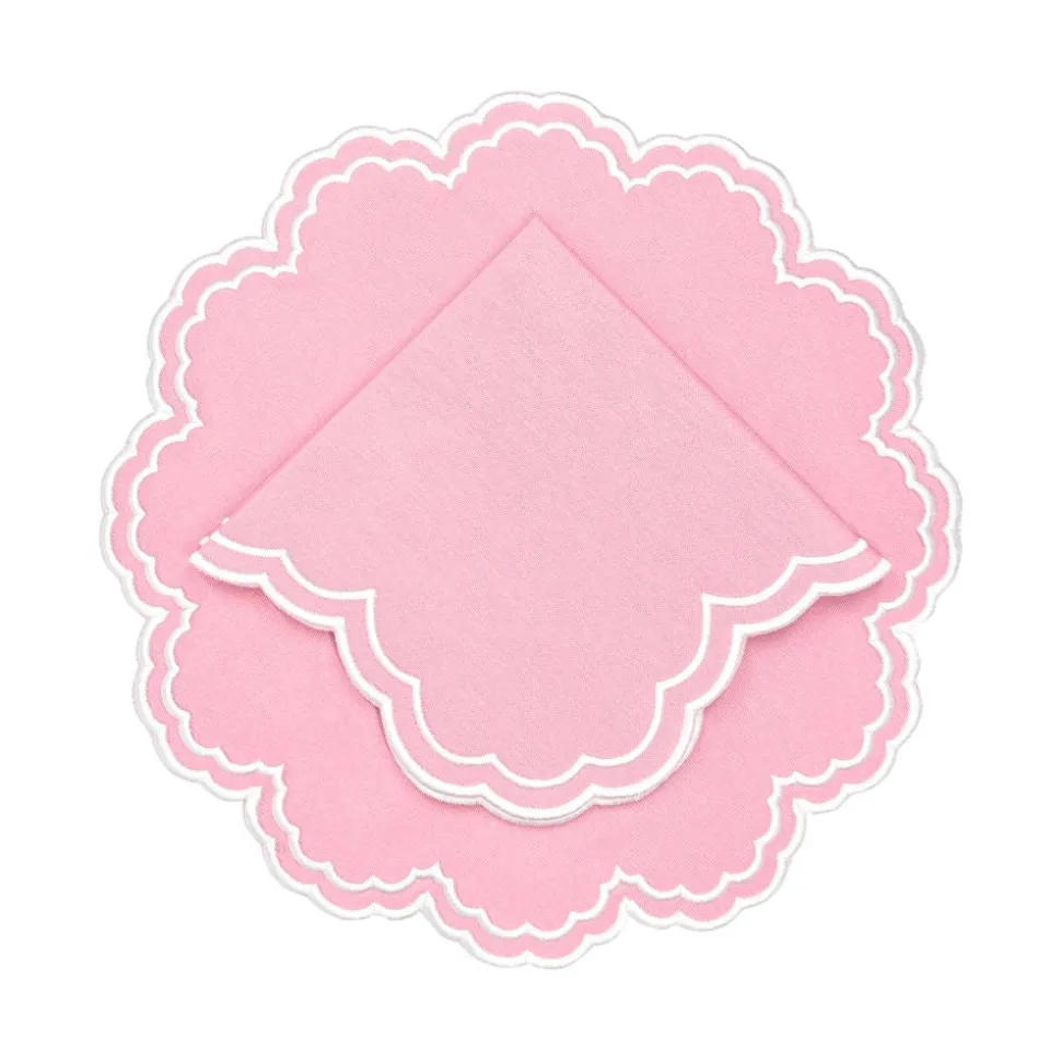Swiss linen, fine cotton and tasteful refinement define Flying Sheep Country’s linens and tabletop items. Founded by two sisters who spent their youth spotting sheep in the English countryside, the brand celebrates both luxury and whimsy in its vibrant prints, fine embroidery and traditional artisanship. Brighten your table with the delightful Bettina Napkin in Pink, Set of 4, beautifully adorned with crisp white wavy scalloped embroidery. This timeless design brings charm to every dining occasion. Pair it with the Bettina Placemat in Pink for a coordinating look.
