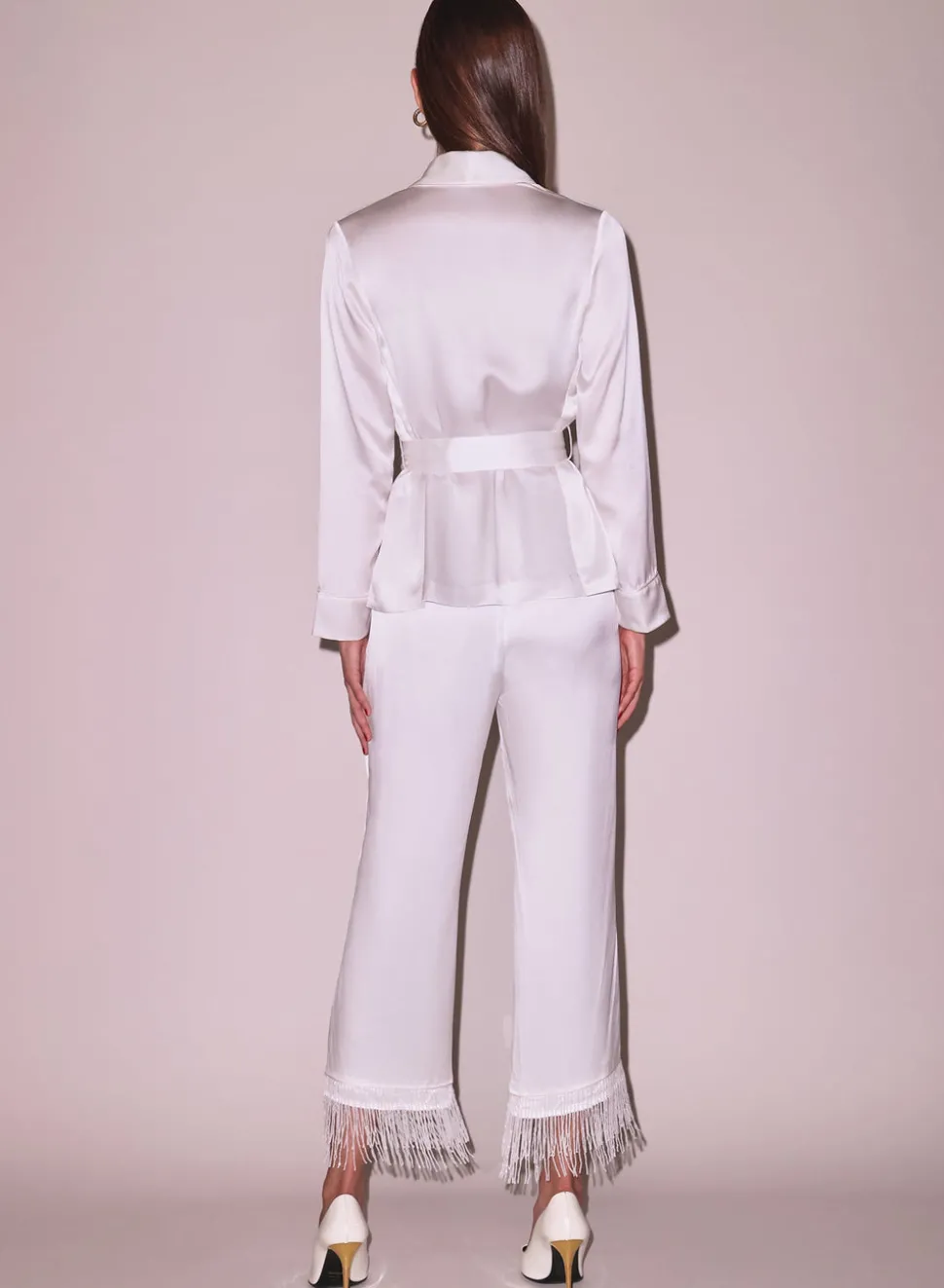 Inspired by Charles Baudelaire’s masterful collection of poetry entitled “Les Fleurs du Mal,” Jennifer Zuccarini founded Fleur du Mal with the belief that wearing beautiful lingerie should be an everyday affair. Tastefully provocative, the luxury brand has amassed a cult following of devotees who adore the sultry and empowering pieces. The Bianca Smoking Jacket, cut from luxe silk charmeuse with a shawl collar and front button closure, features silk sash trimmed with hand-beaded swinging fringe embellishment.