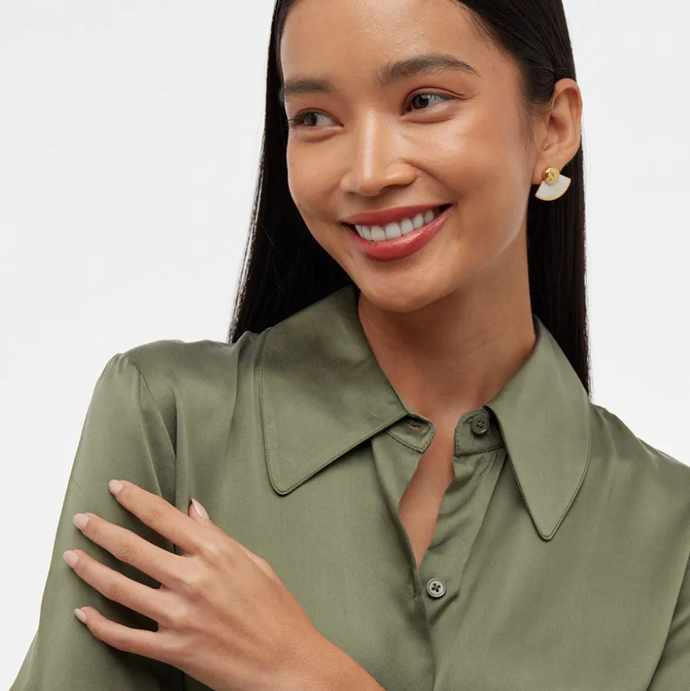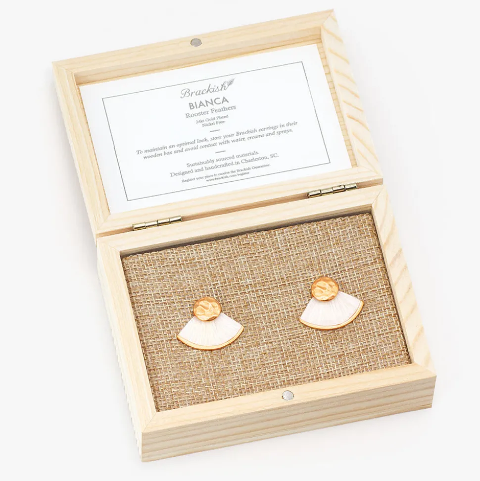 Brackish began with one feather bow tie designed by Ben Ross and gifted to his groomsman, Jeff Plotner. Since its inception, the brand has blossomed into a full line of men’s and women’s accessories designed and handcrafted in Charleston, South Carolina with each piece focused on honoring the beauty found in nature. The Bianca Stud Earrings are simple in design but intricate in craftsmanship. These elegant earrings feature over 50 feathers per pair, with each one layered to mimic the fan shape of the hardware.