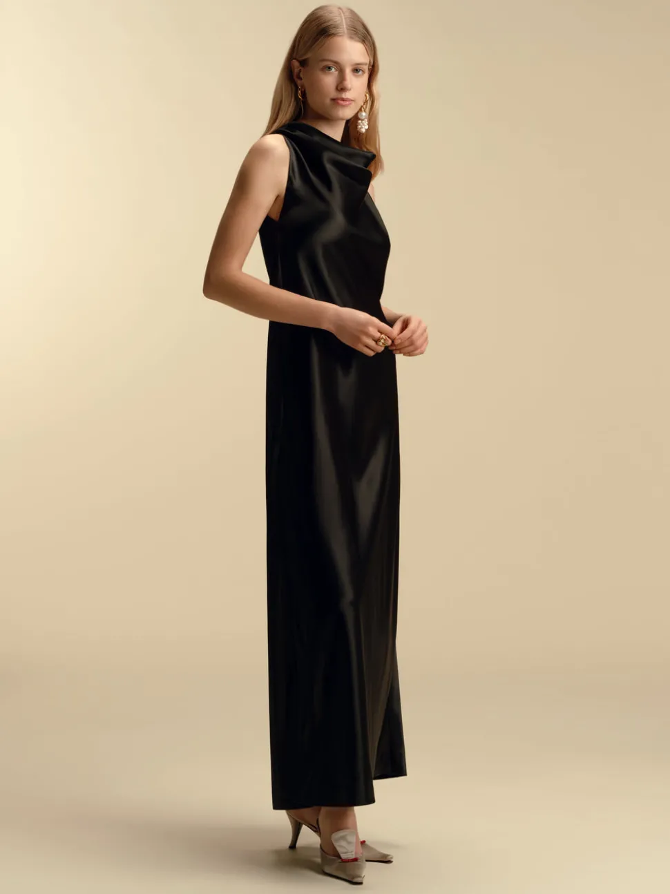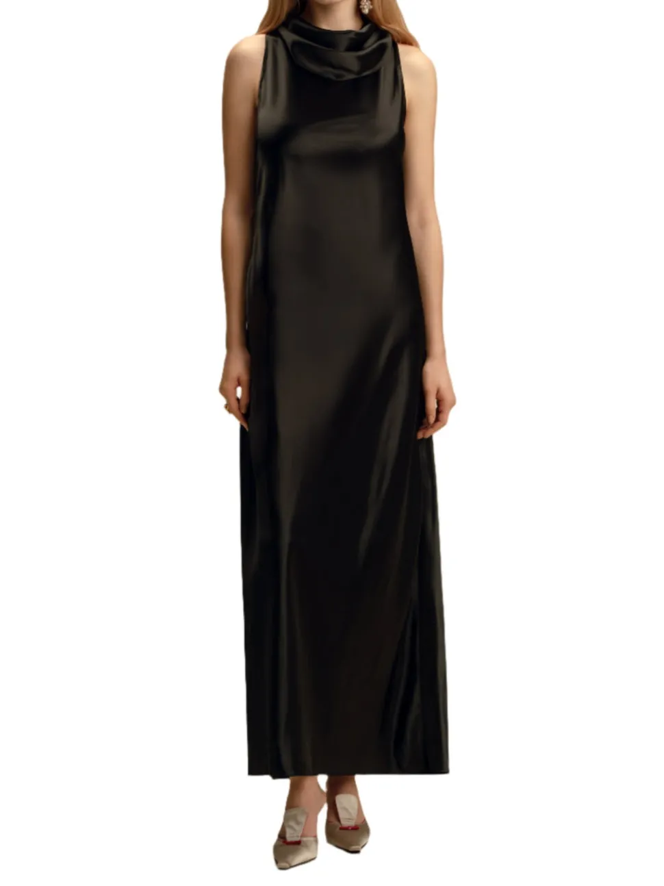 Founded in 2016 by sisters Marina and Francesca Moscone, the label gravitates toward a tactile approach, twisting and draping fabrics by hand to create a softly seductive design using custom jacquards, fil-coupés, and silk wools, all exclusively developed in Italy, rendered in precise shapes and tailoring. A subtle tension between the masculine and feminine underpins each collection. This classic evening dress boasts an elegant cowl-neckline detail, skimming over the body for a modern, feminine sensibility.