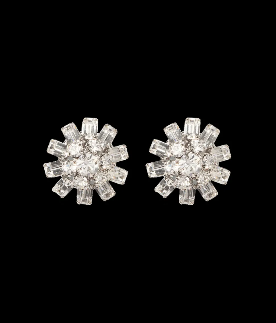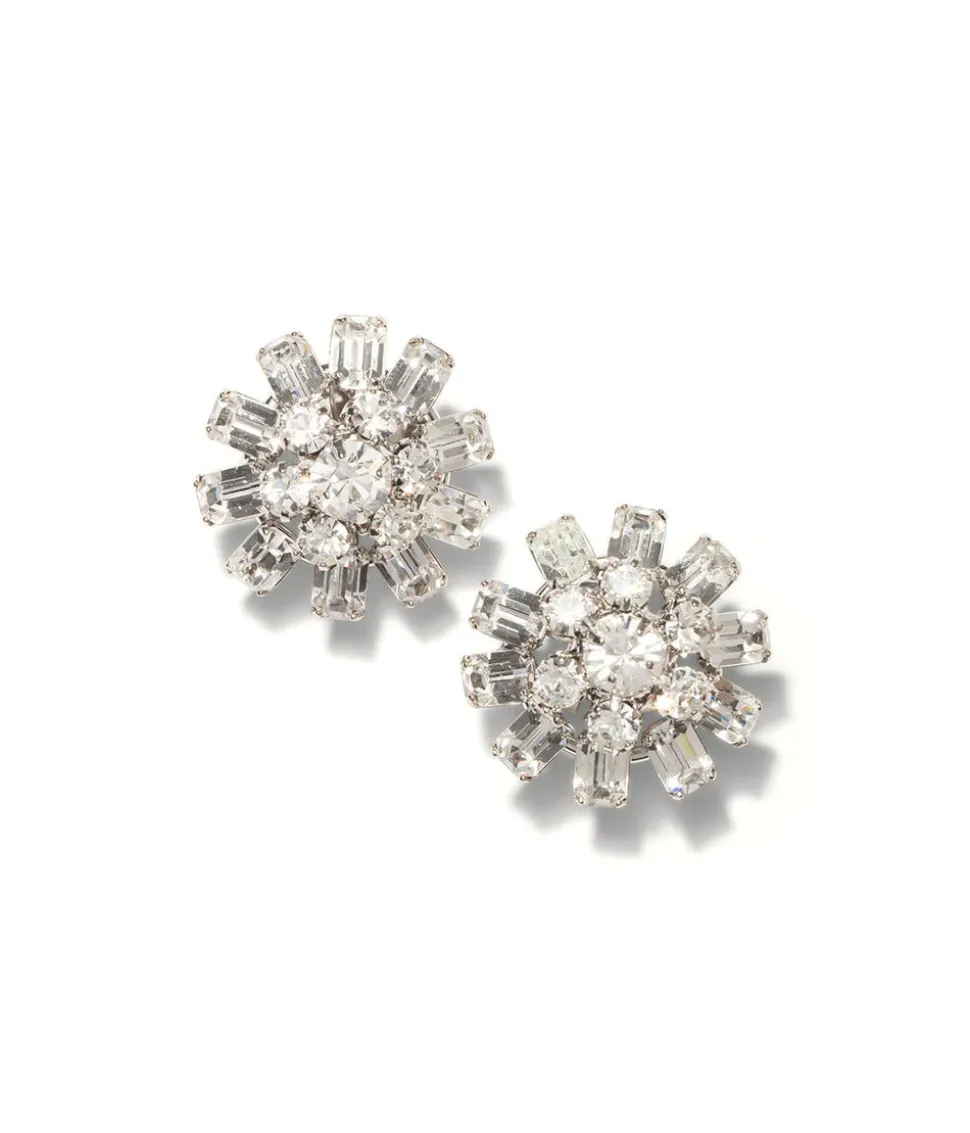 Hand-set crystal stones, a shiny silver finish over brass, and surgical steel posts. Also available in clip-ons. Handmade in the USA.