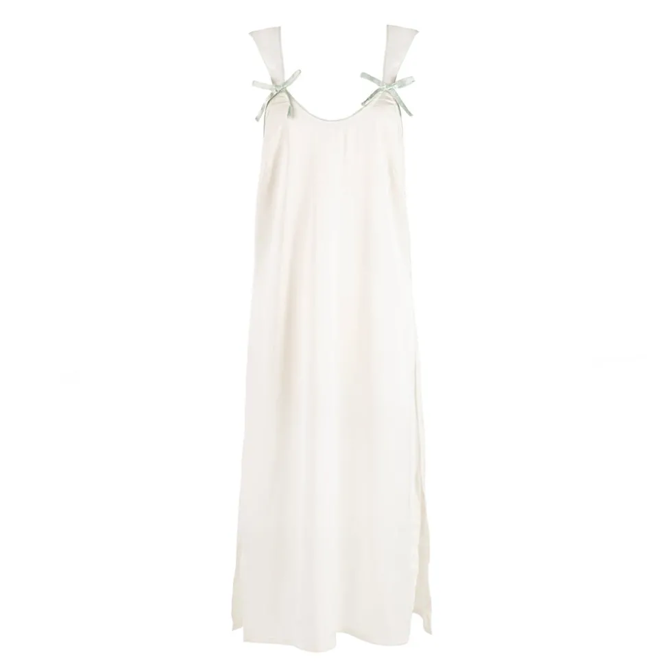 Poly-satin fabric. Pullover tank style. Bow detailing. Straps and neckline piped in mint satin to match bows. Hits mid-calf. Side slits.