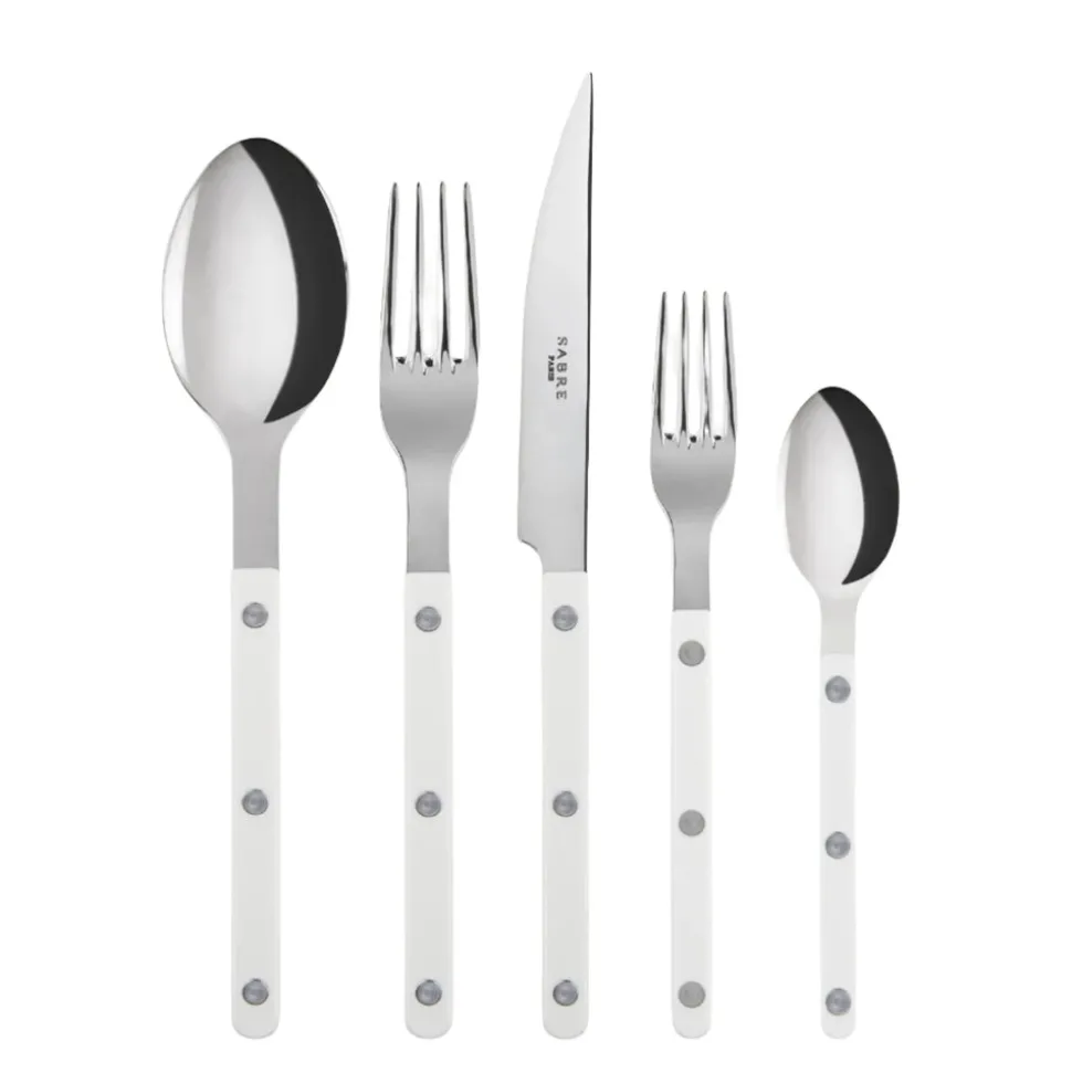The Sabre Paris Bistrot Place Setting is wonderfully versatile, equally at home on traditional and contemporary table settings. The slender, riveted acrylic handle is at once sleek and timeless. This 5-piece set includes a dinner knife, dinner fork, soup spoon, salad fork, and teaspoon.