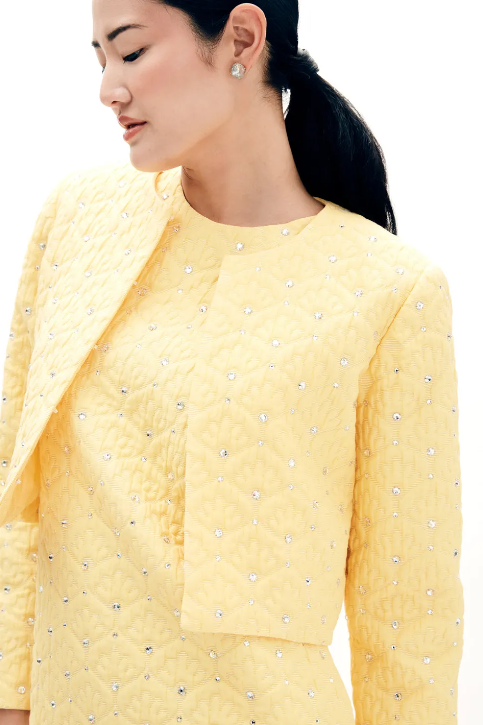 MAE New York seeks to revitalize New York’s historical garment district by creating small-batch and made-to-order collections—modern interpretations of 1960s glamor—highlighting tailoring, luxury materials, and craftsmanship. Crafted from a vibrant lemony Italian cloque, The Blaire Jacket in Crystal Cloque is meticulously adorned with over 600 hand-applied crystals. This jacket catches the light—and attention—with effortless elegance. A true statement piece, Blaire is designed to elevate any occasion.