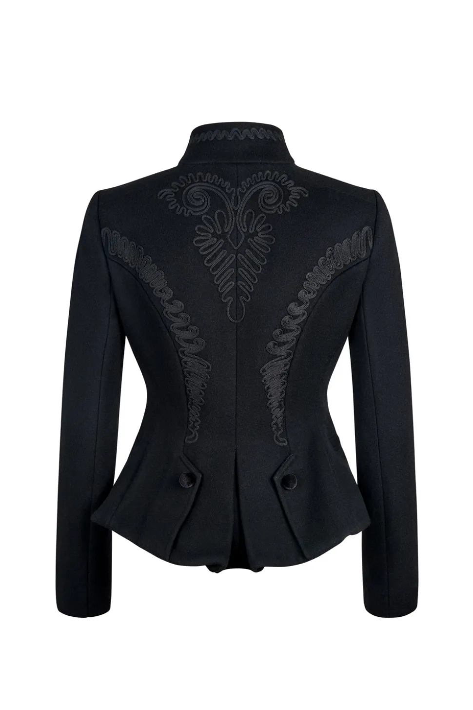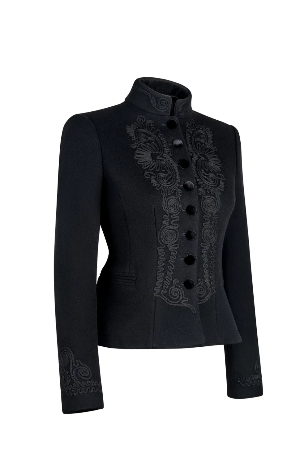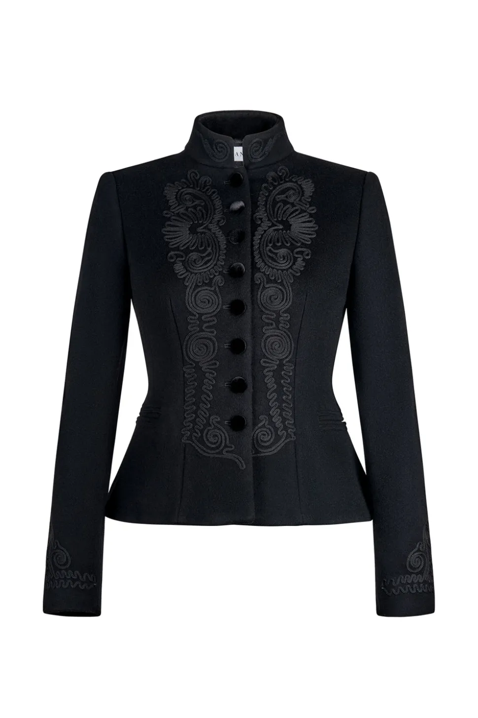 Looking to their Peruvian and Bavarian heritage, lifelong friends Sabrina Burda and Noelle Pallais were inspired to create Sanoë by rummaging through their grandmothers’ closets. With an eye on slow fashion and the other on contemporary style, the NYC-based brand designs their jackets—based on alpine peasant “trachen jacken”—to stand the test of time in small batches using ethically sourced fabrics. The Blaire Notte Jacket in Black is a vision of midnight opulence. Tailored with a velvet touch for soirées that stretch into dawn, this piece is where elegance and mystery linger long after the music ends.
