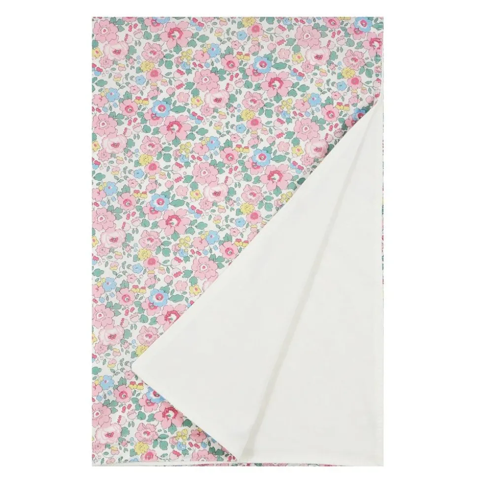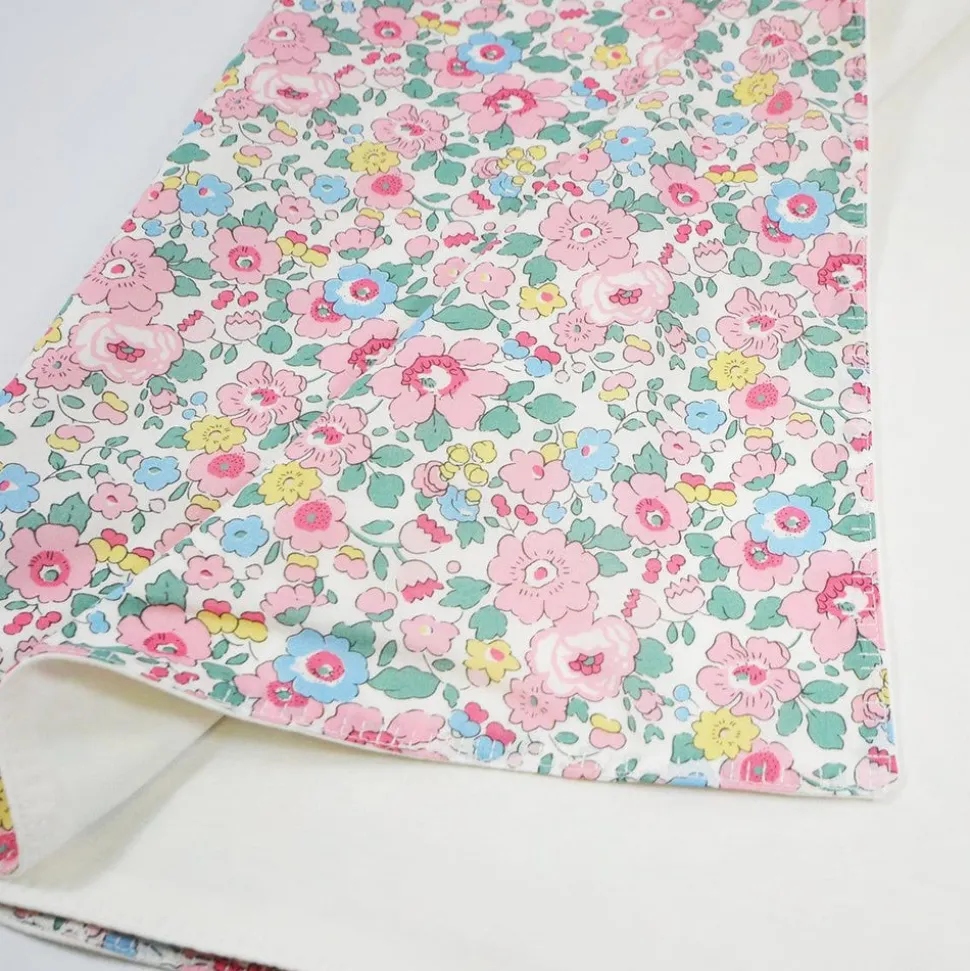 Front: 100% Liberty bonville cotton. Back: 95% cotton jersey, 5% elastane. Soft jersey on reverse side. Available in 3 different sizes. Finished with a pretty blanket stitch edge. Betsy Candy Floss has been exclusively developed for Coco & Wolf.