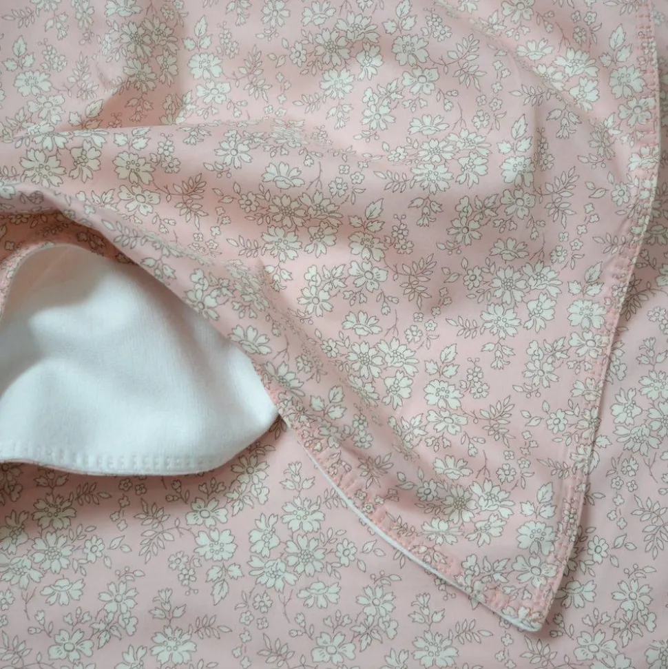 Front: 100% Liberty bonville cotton. Back: 95% cotton jersey, 5% elastane. Soft jersey on reverse side. Available in 3 different sizes. Finished with a pretty blanket stitch edge.