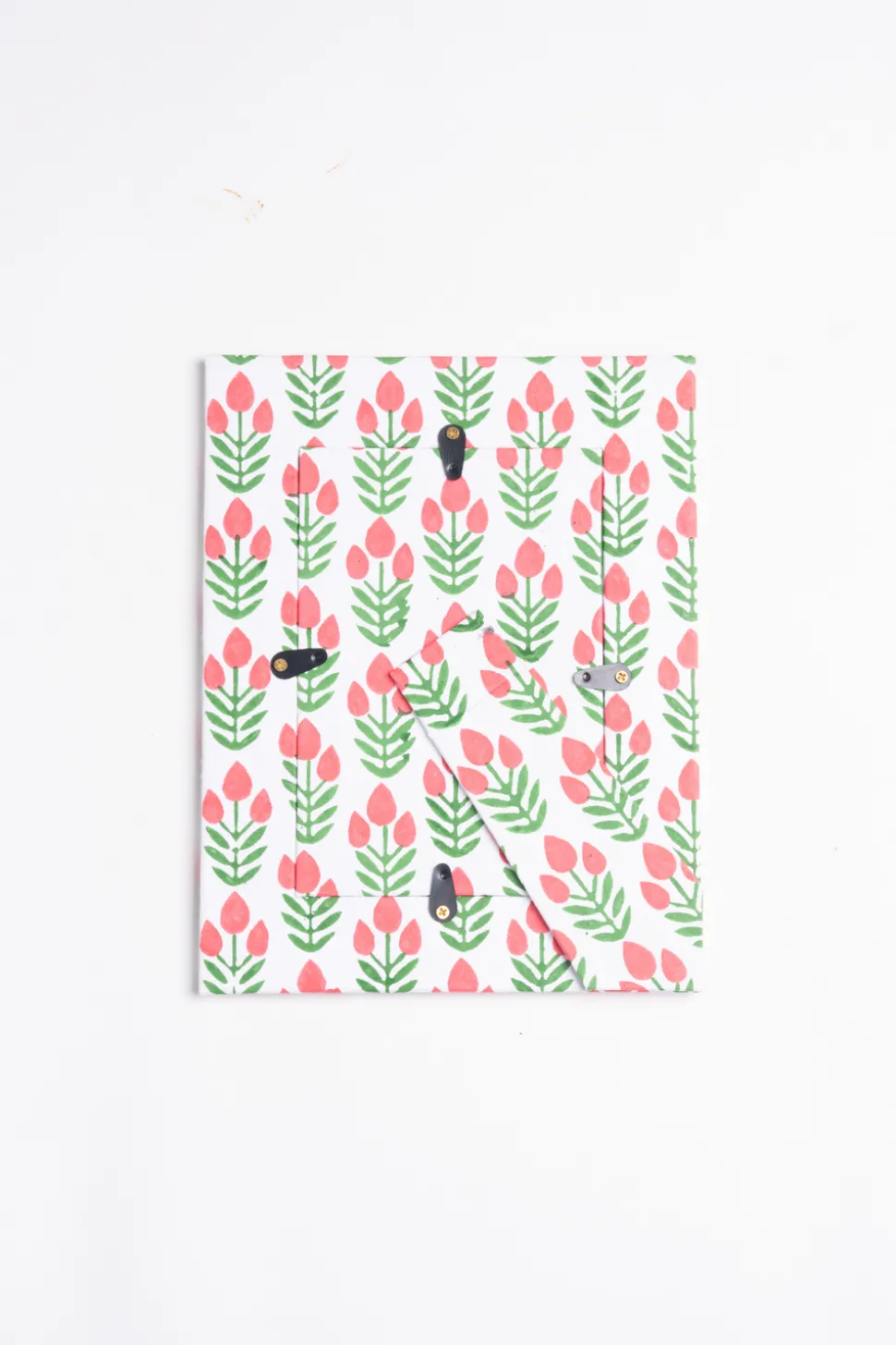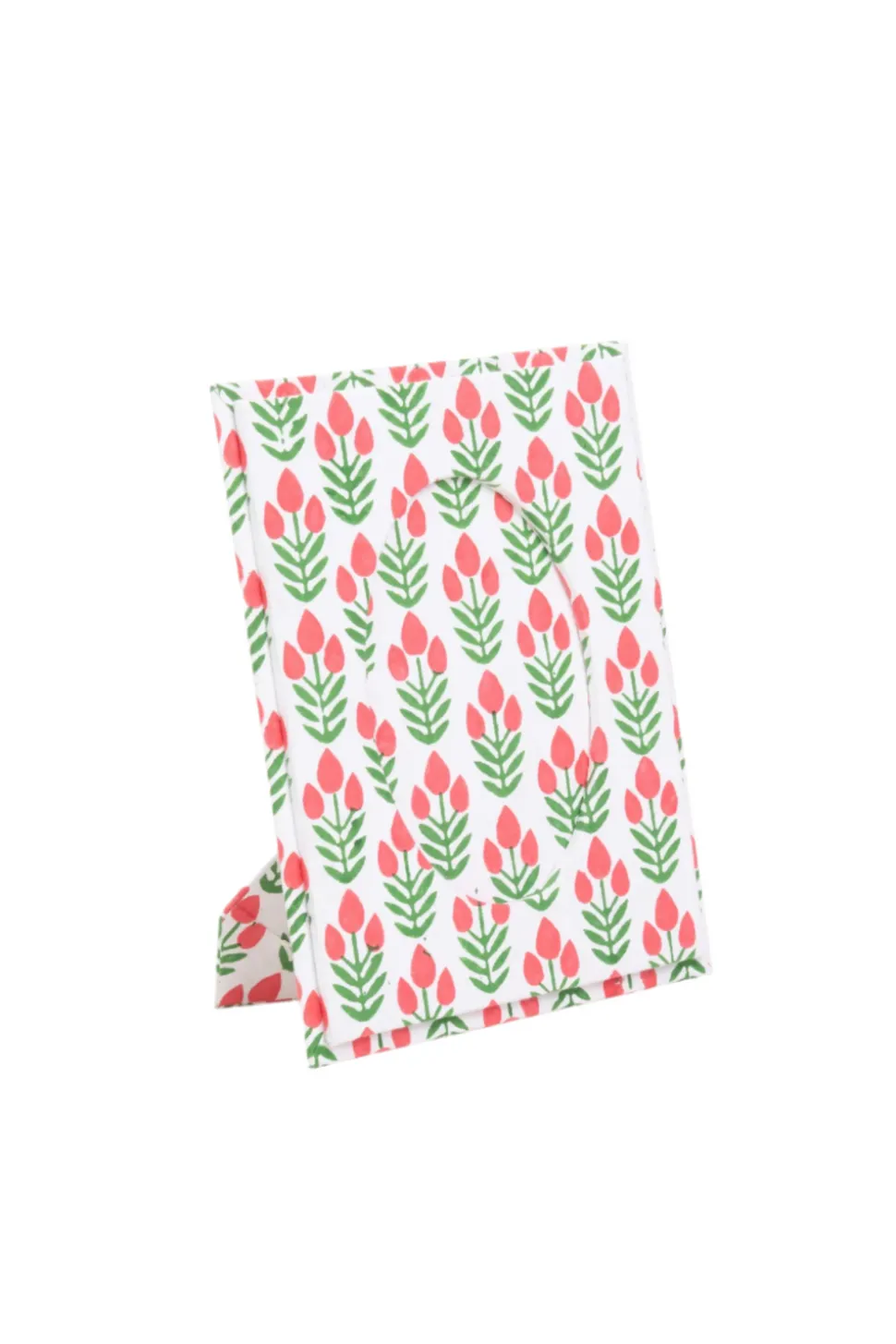 Made from 100% recycled cotton handmade paper. Hand blockprinted by artisans in Jaipur. Fits a 4″ x 6″ photograph in a circular opening. Each piece is unique.