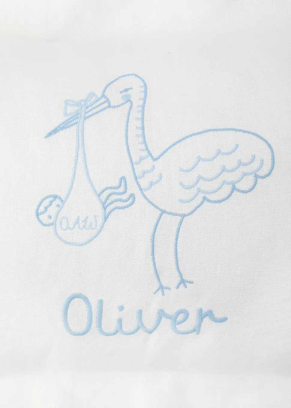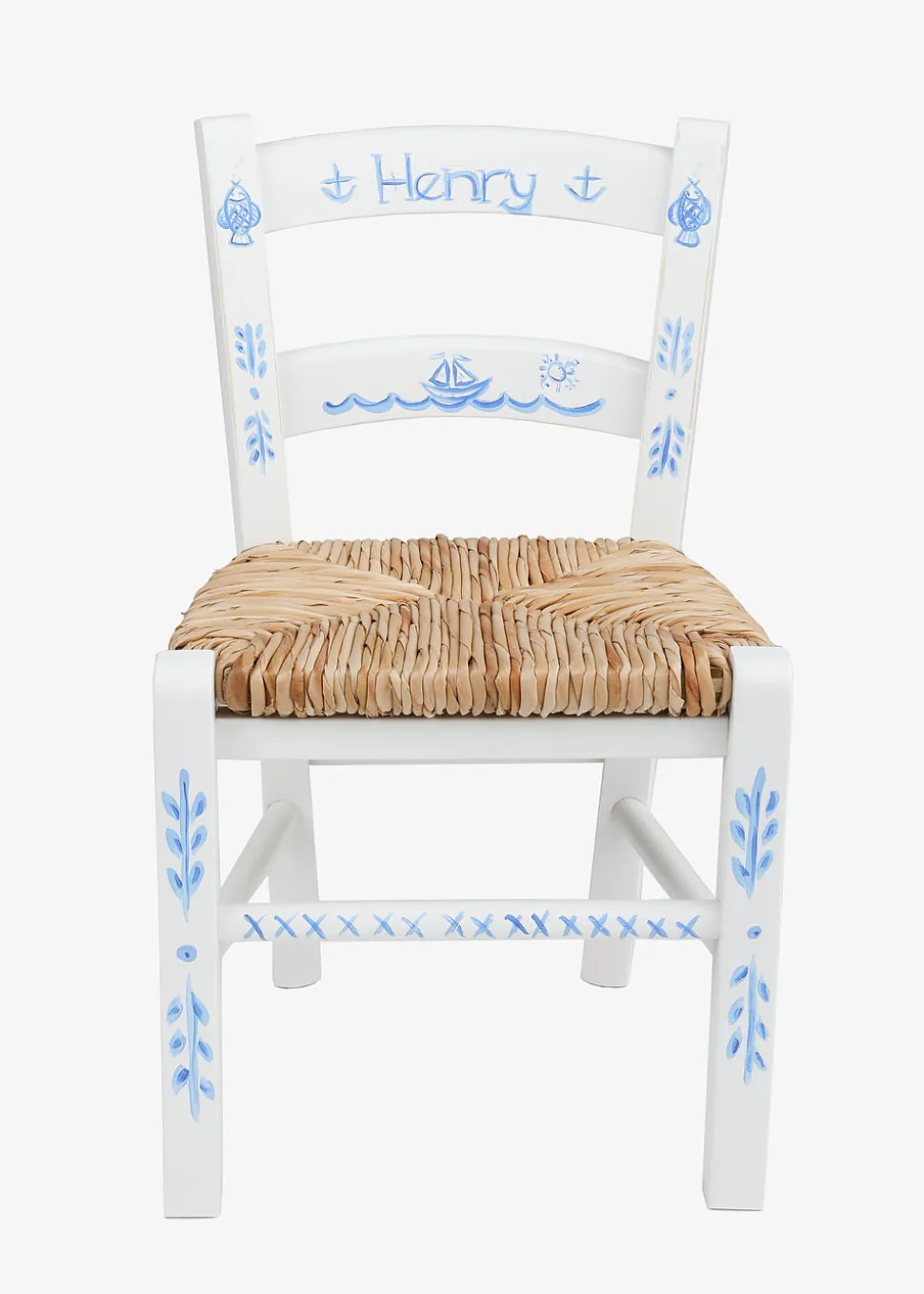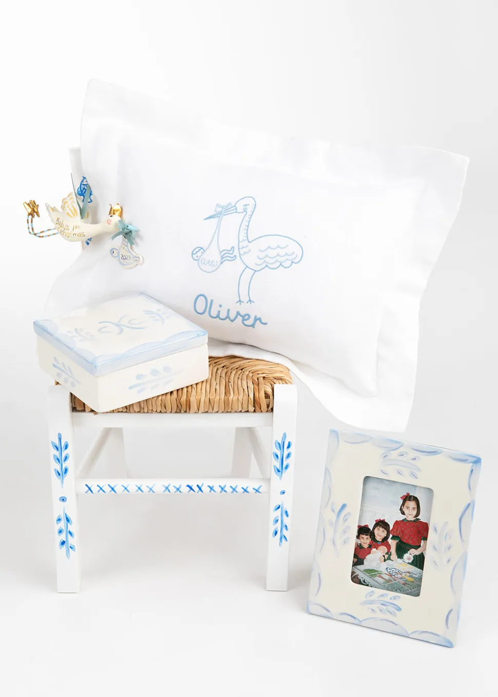 Self-taught artist Tricia Lowenfield crafts one-of-a-kind whimsical pieces that will become family treasures in time. Entirely handmade, the Blue Baby Bundle is the ultimate gift for a little one. Inside, you will find a hand-embroidered pillow, personalized stork Christmas ornament, hand-painted chair, monogrammed trinket box, and, lastly, a hand-painted picture frame.
