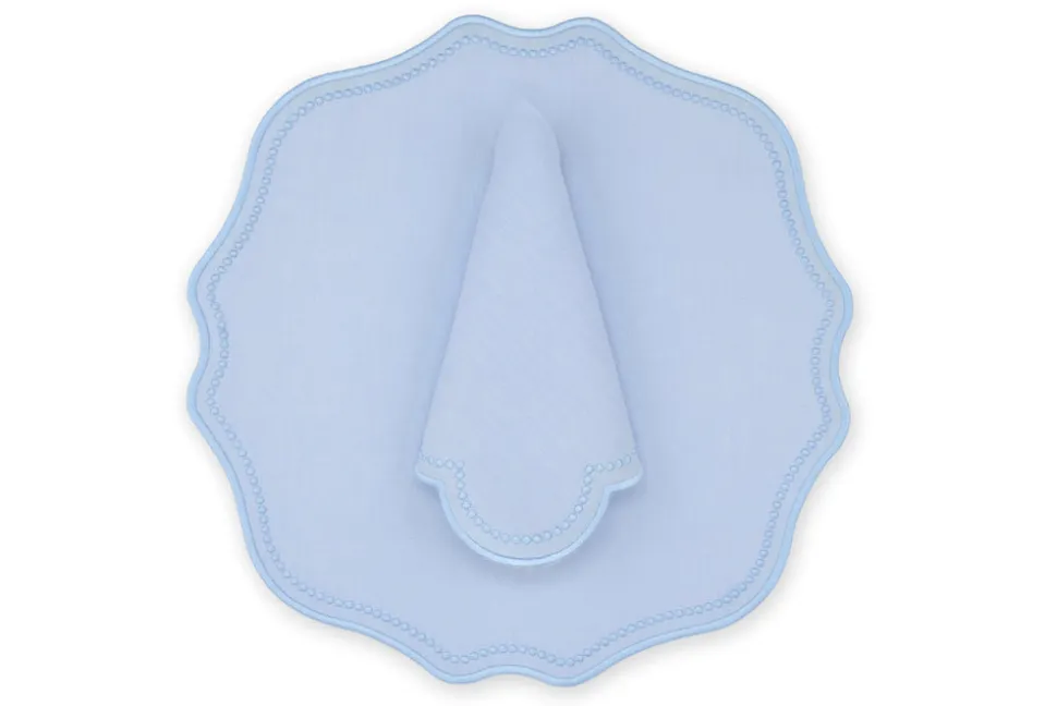 Founded in 2020 by three friends, TriChi looks to the intersection of the Mediterranean, Atlantic, and Anatolia for the inspiration for their superior clothing and homewares. Environmentally friendly manufacturing, the highest quality fabrics, and a passion for great design combine in the brand’s uniquely tasteful approach. TriChi’s napkins and placemat sets are exemplary tabletop additions, regardless of how formal or casual the affair. The Blue Dotted Air Blue Linen Napkin and Placemat, Set of 2 presents itself in a classic fashion with a scalloped edge.