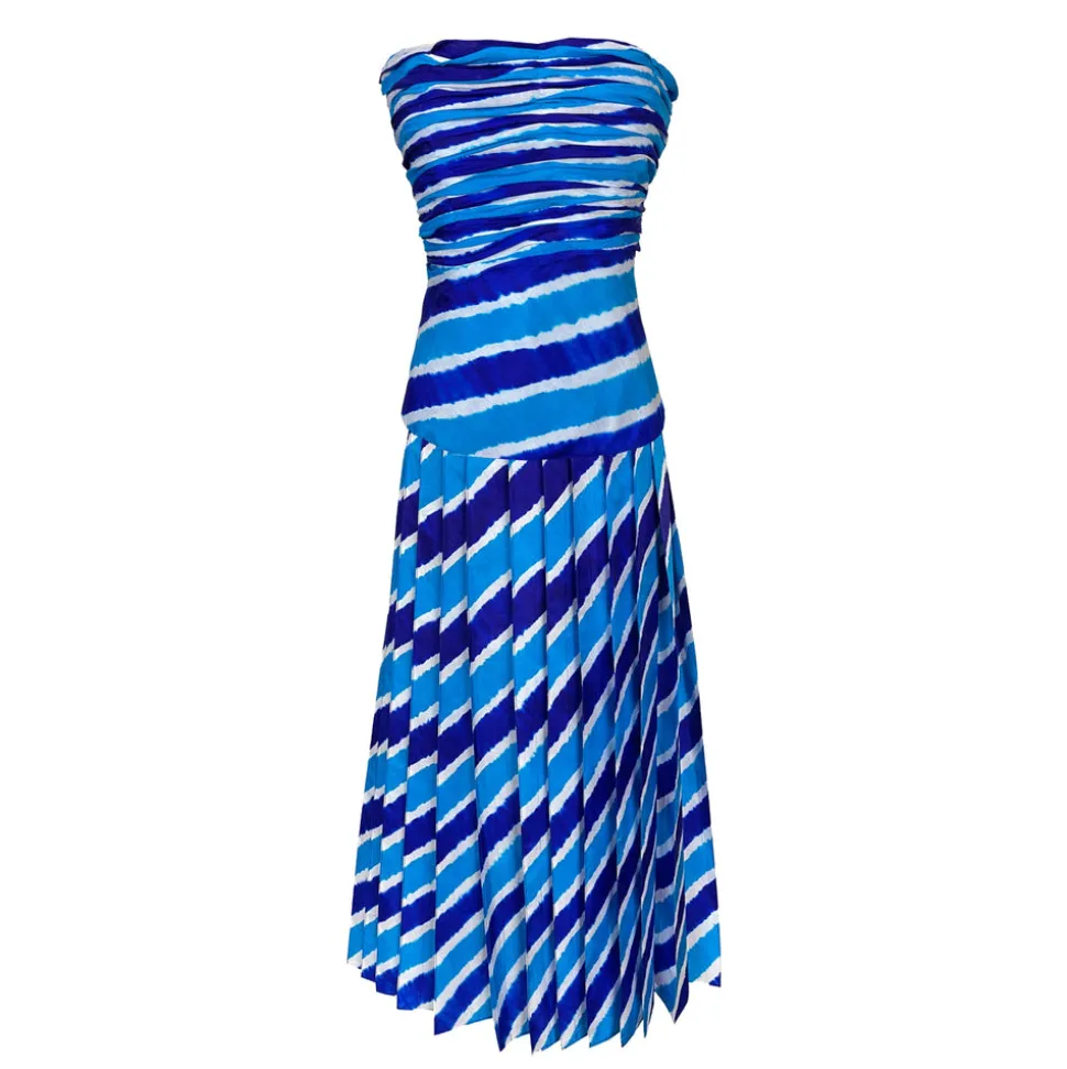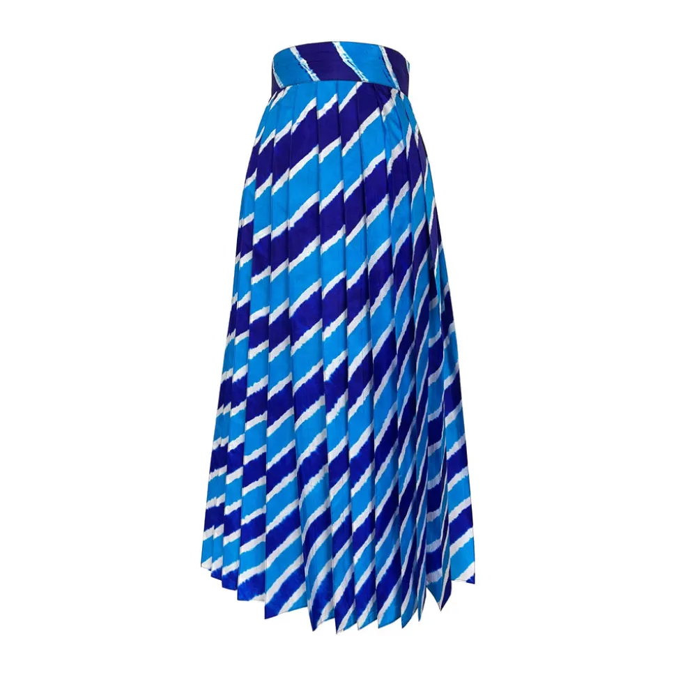 De Castro showcases a seamless and unique blend of traditional Indian craftsmanship, contemporary design, and the founder’s Colombian heritage. Every piece is handmade by artisans, using time-honored techniques and the finest cotton and silk fibers, resulting in exceptional quality, sustainability, and style. Experience the beauty of Indian silk fabrics with the Blue Leheriya Set. The unique striped patterns are created through a resist dyeing technique, exclusive to the state of Rajasthan in India. The set includes a draped top and pleated midi skirt, making it a staple in any wardrobe.