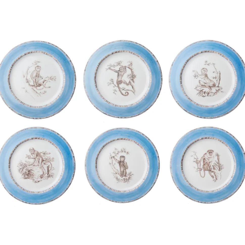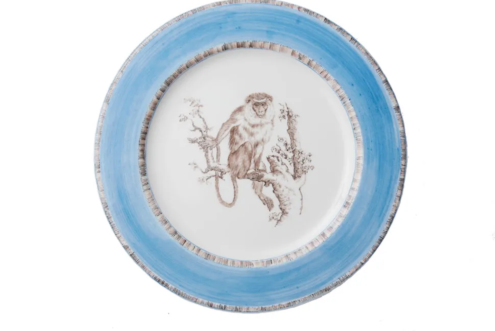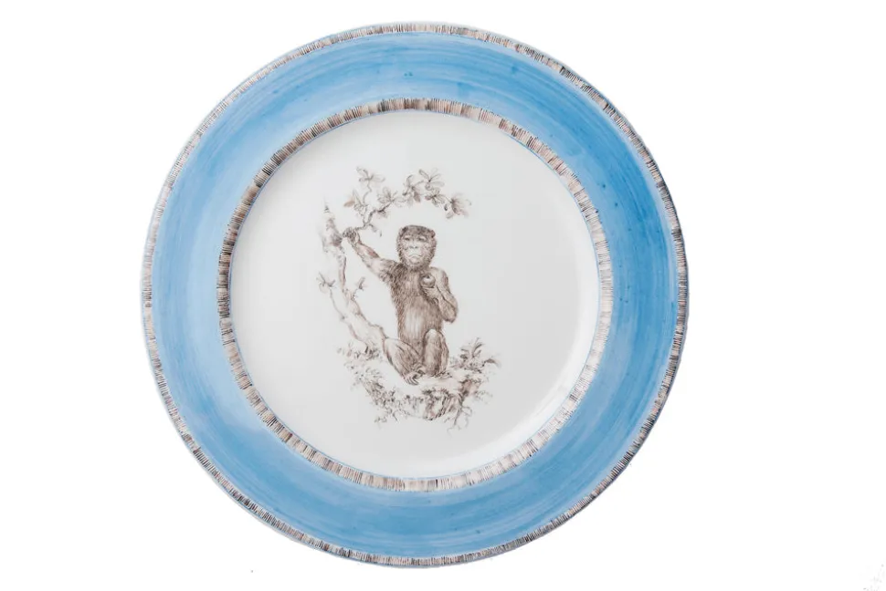 Entirely handcrafted and hand-decorated by artisans at the Milanese ceramic workshop Paravicini, this set of 4 dinner plates has a whimsical, Old-World feel. The detailed design features monkeys posing in various positions, surrounded by a blue border.